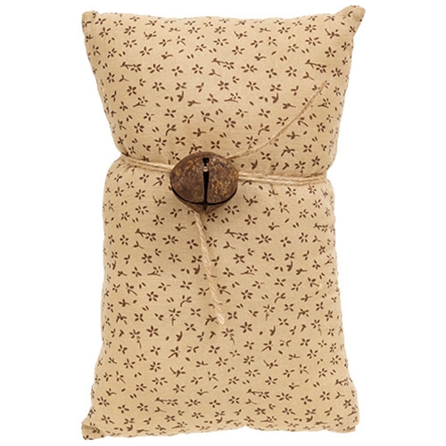 Primitive Americana Jingle Bell Pillows are vintage-inspired accent pieces for everyday Americana decor. Each pillow features a rusted jingle bell accent tied with a jute twine string. Navy fabric with an allover cream-colored star print covers the smallest pillow. The medium pillow features beige floral fabric, and the large pillow's fabric features red and off-white stripes.