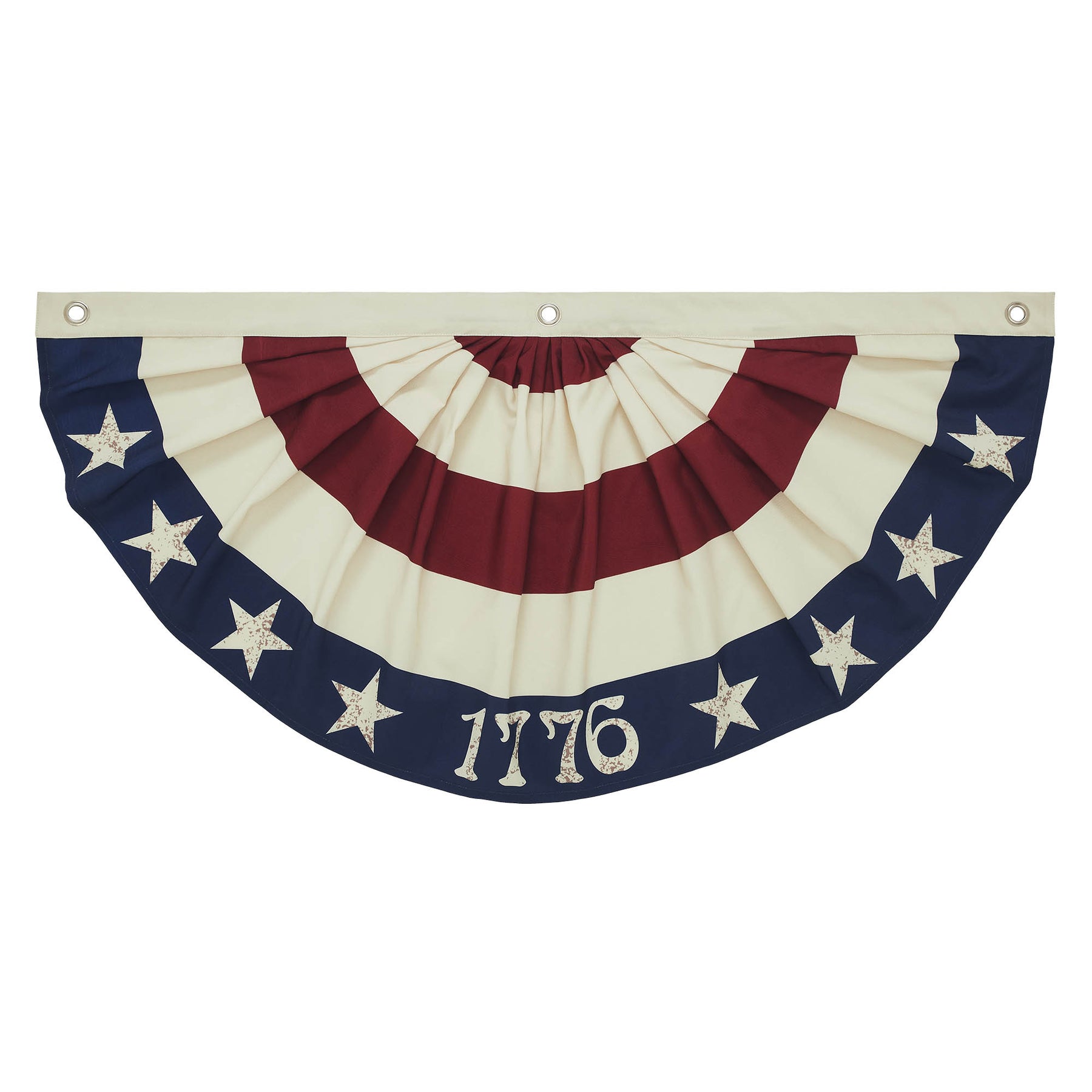 Celebrate the spirit of Independence Day with the VHC Brands Patriotic My Country 1776 USA Bunting Flag 18x36. This classic half-circle bunting flag features deep pleats in alternating deep red and creme stripes, creating a timeless patriotic design. A bold navy blue stripe with creme stars and the iconic "1776" adds a meaningful tribute to America's founding. Designed with durable grommet holes, this banner is easy to hang, making it a versatile addition to your holiday decor. Ideal for both indoor and outdoor use, this bunting flag is perfect for decorating entryways, living rooms, or dining rooms to create a warm and festive atmosphere.