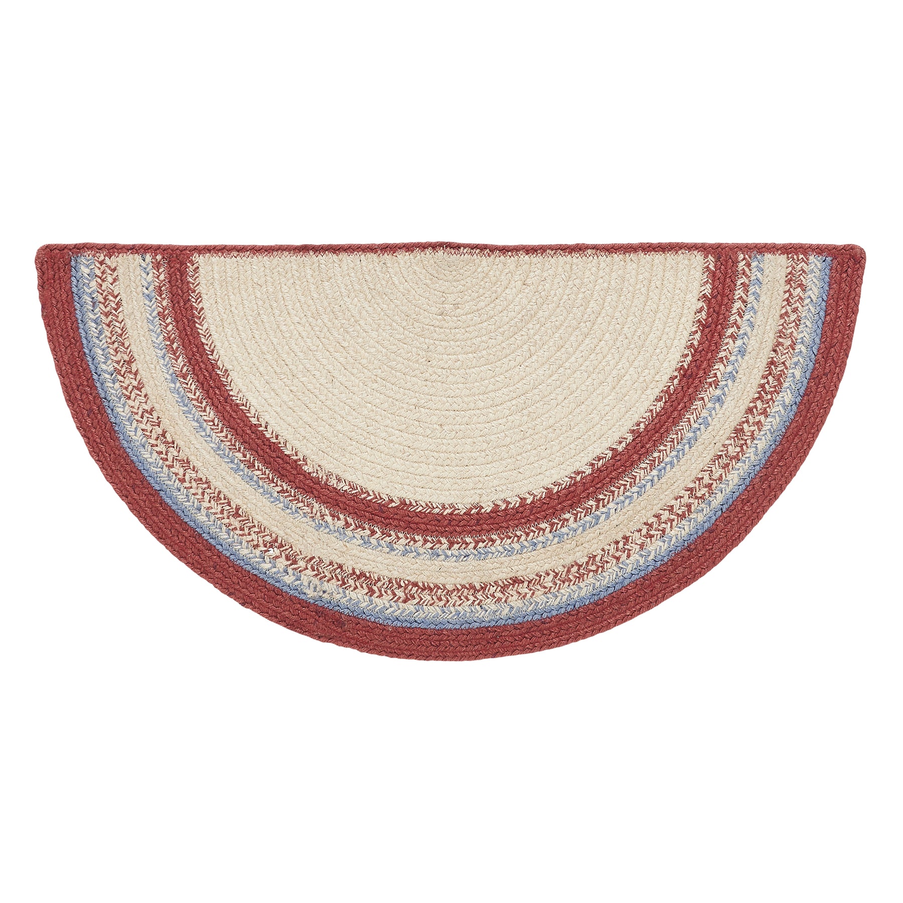 Create a bright, patriotic feeling with red and white stripes and blue stars in a curl-resistant jute blend that adds style and safety anywhere a small accent rug is needed. The Celebration Jute Rug measures 16.5x33 inches and features a classic half circle shape and tight braids constructed with a durable jute blend. The special blend relaxes faster and stays flat. Features a blend crisp white, stone blue, and barn red for an Americana look that complements a wide array of country farmhouse decor.