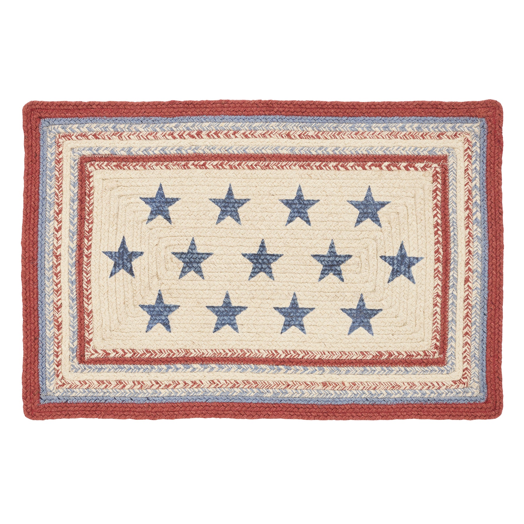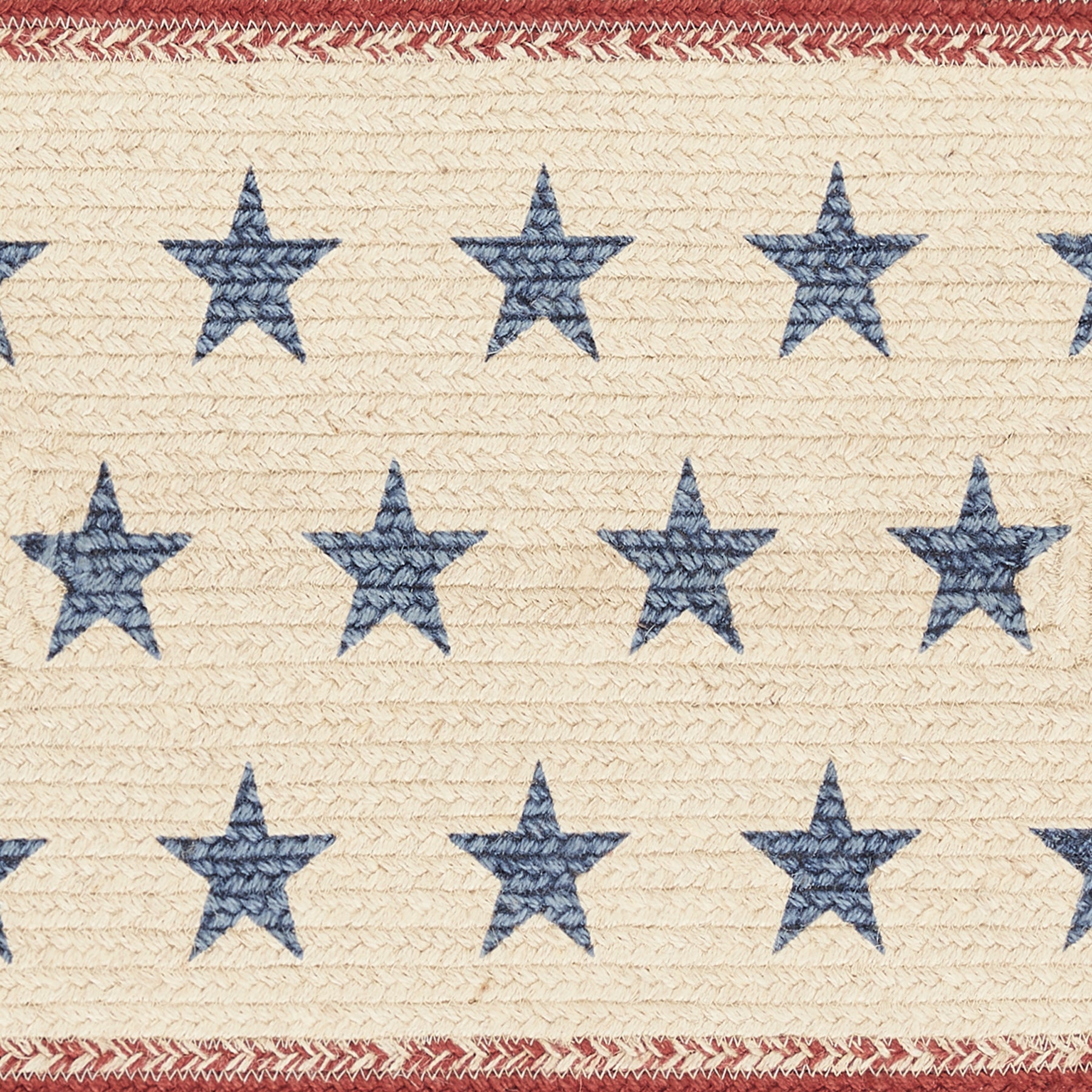 Create a bright, patriotic feeling with red and white stripes and blue stars in a curl-resistant jute blend that adds style and safety anywhere a small accent rug is needed. The Celebration Jute Rug measures 20x30 inches and features a classic rectangle shape and tight braids constructed with a durable jute blend. The special blend relaxes faster and stays flat. Features a blend crisp white, stone blue, and barn red for an Americana look that complements a wide array of country farmhouse decor.