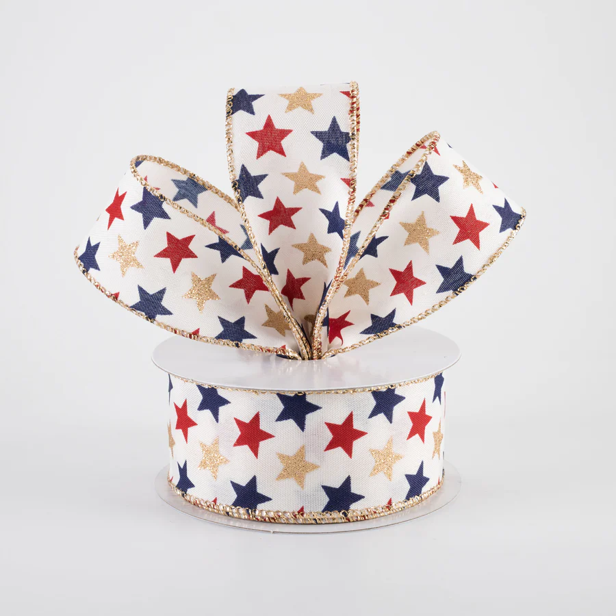 Gold glittered stars, navy blue stars and red stars are printed in equal sizes at equal distances on this ivory canvas ribbon.