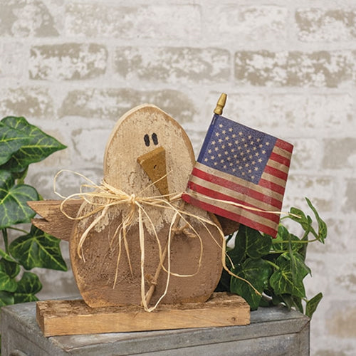 The Rustic Wood Baby Eagle is a unique decor piece crafted with patriotic style. Made from wood with chunky, layered design, the sitter depicts a bald eagle standing on a wood plank base. The eagle is painted with a brown body, cream colored head, and mustard yellow beak. A cutout pair of wings are painted brown and attached to the back of the eagle. The eagle holds a weathered American flag and features dried straw and jute rope accents. A heavily distressed finish gives the eagle a rustic lookk.