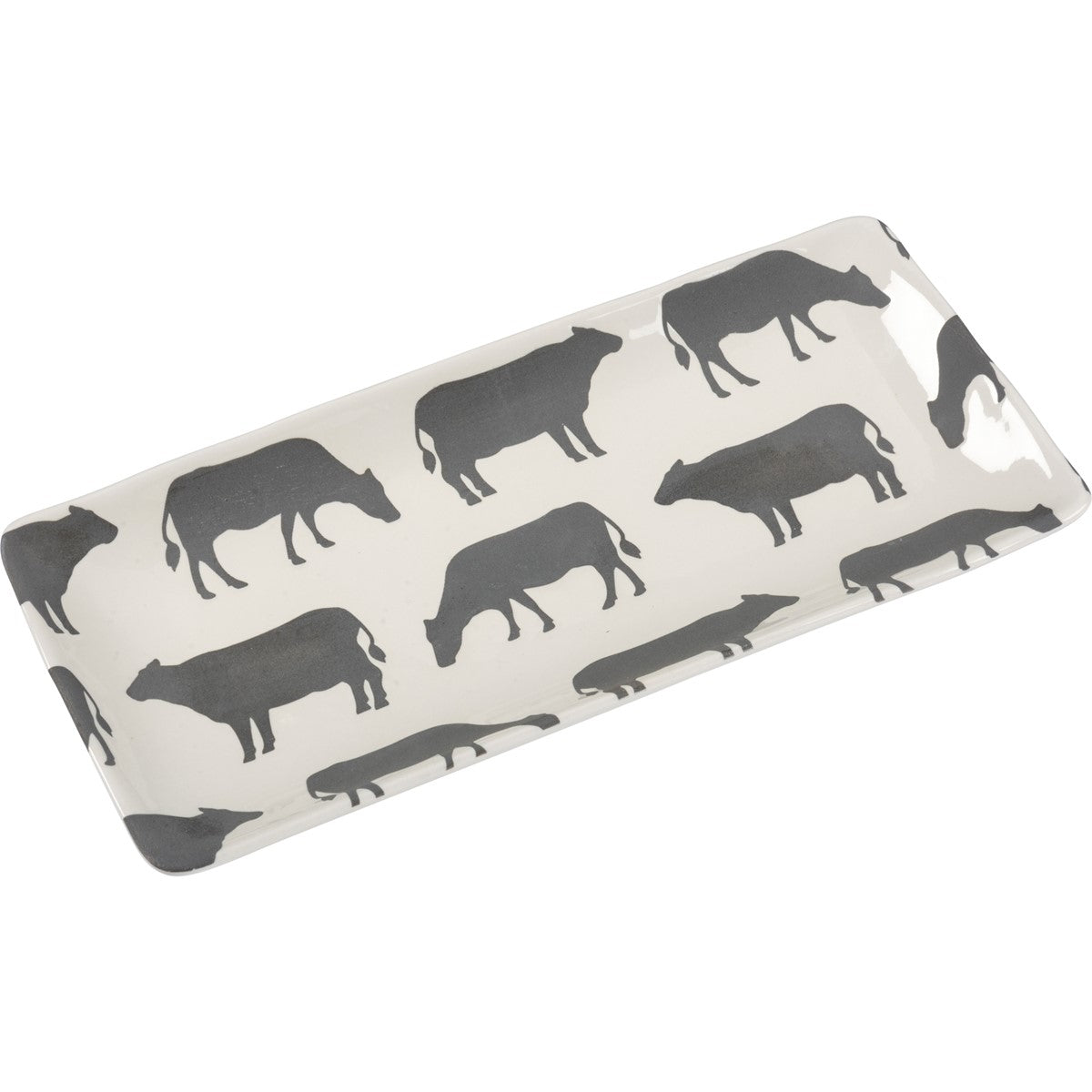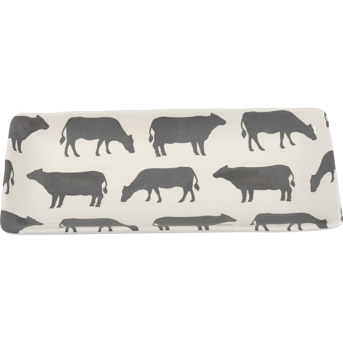 A white rectangular stoneware platter from our Tabletop Collection featuring gray cow designs. Microwave, dishwasher, and food safe.