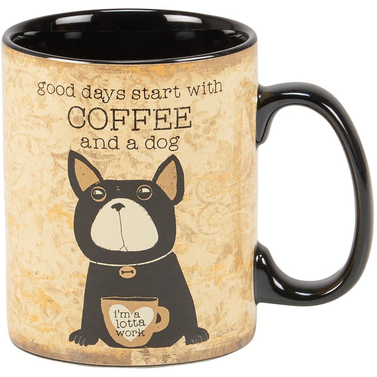 A stoneware 20 oz mug from our Pet Collection displaying a double-sided design of a dog sitting next to a coffee cup that says "I'm A Lotta Work" in a rustic style. Design also features a fun coffee and pet-themed sentiment that reads "Good Days Start With Coffee And A Dog." Our Coffee And A Dog mug is microwave, oven, dishwasher, and food safe for convenient use. A fun pet-themed gift perfect for everyday drinkware.