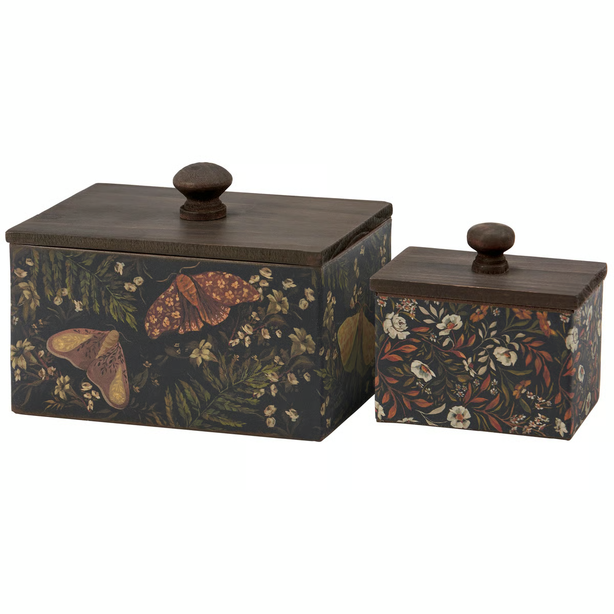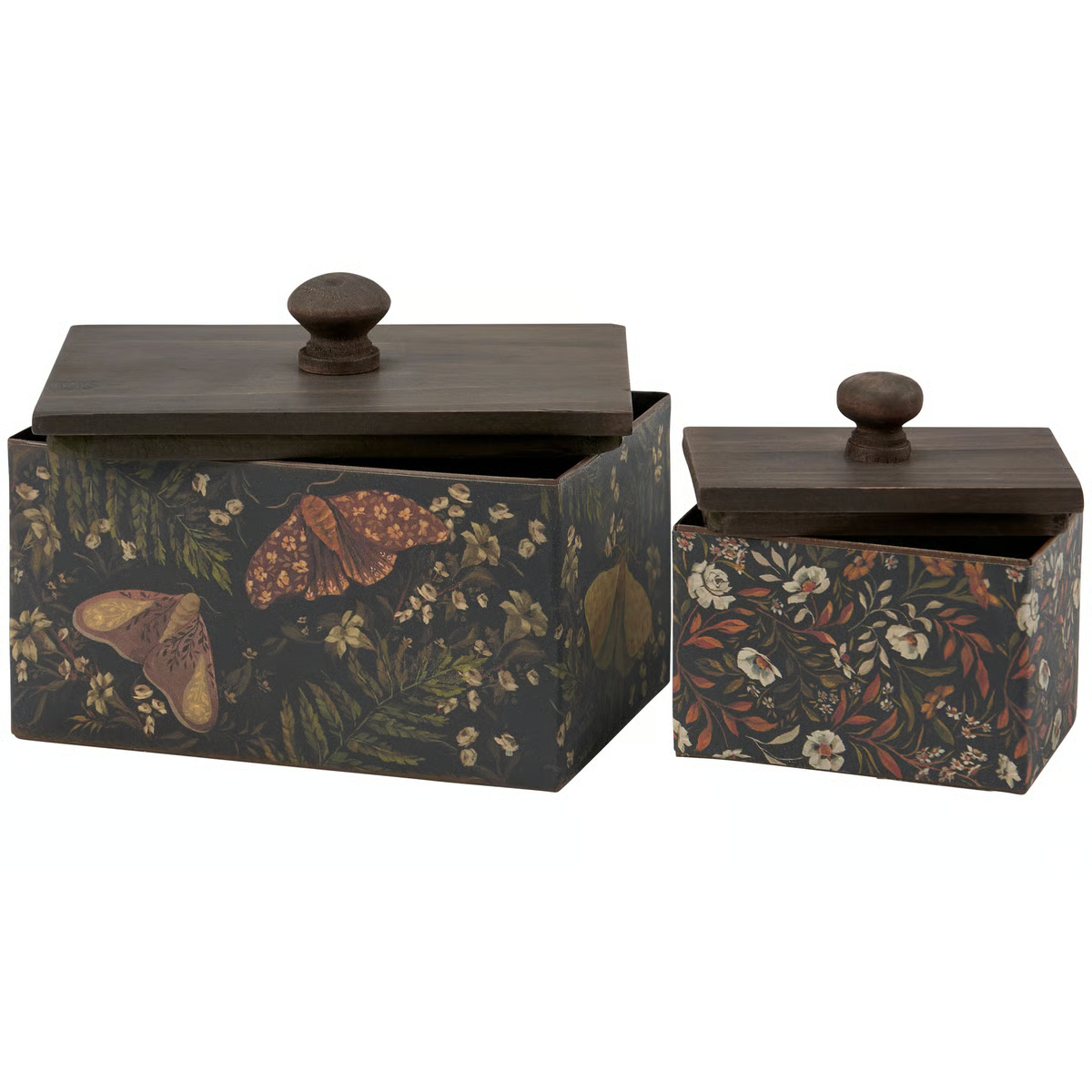 A galvanized metal bin set from our Moody Collection including two different sized rectangular bins with natural wood lids that can nest within each other for easy storage. Each bin displays full wrap-around designs of garden themed patterns in moody color palettes. Large bin displays butterflies and florals with the small bin displaying florals. Our Hidden Garden bins are perfect for organizing household items. A moody garden-themed home accent with a variety of everyday display options.