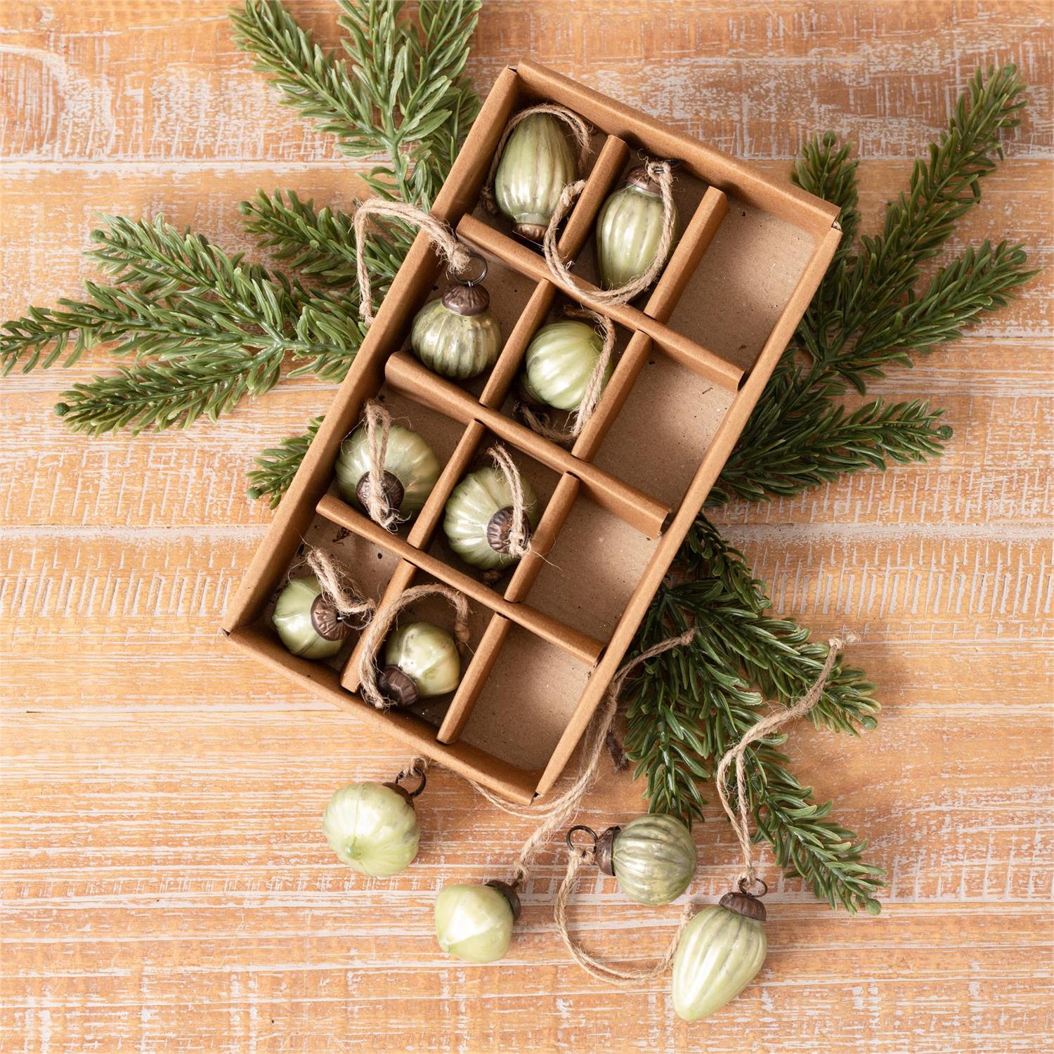 Add a hint of vintage sparkle to your tree with this set of twelve mini green glass ornaments. Each ornament features a soft, muted green hue with a ribbed texture and jute hanger for a touch of rustic charm. Perfect for smaller trees, garlands, or gift wrapping accents, they come neatly boxed for easy storage or gifting.