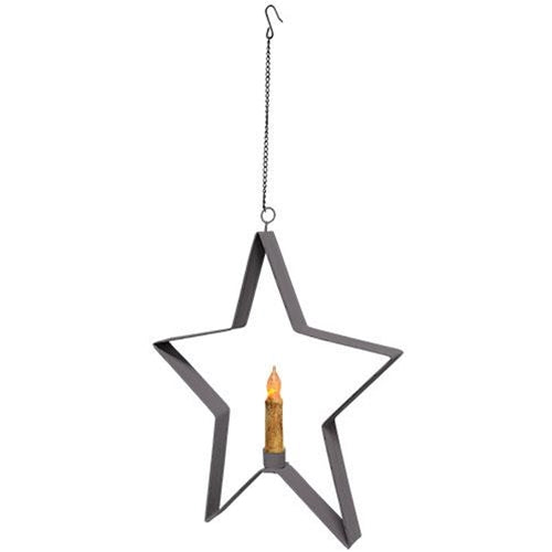 The Farmhouse Star Taper Holders are an assortment of three decorative hanging taper candle holders made of sturdy metal with a cream, gray, or taupe finish. The holders are star-shaped with a taper cup and chain hanger with a metal hook. Pair this holder with a taper candle (4") and display hanging for a chic and charming touch to the home year-round.