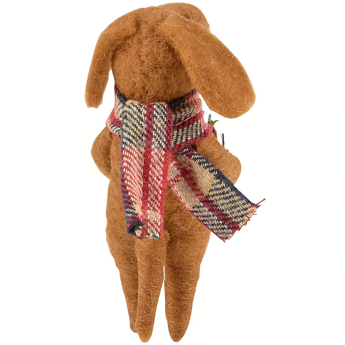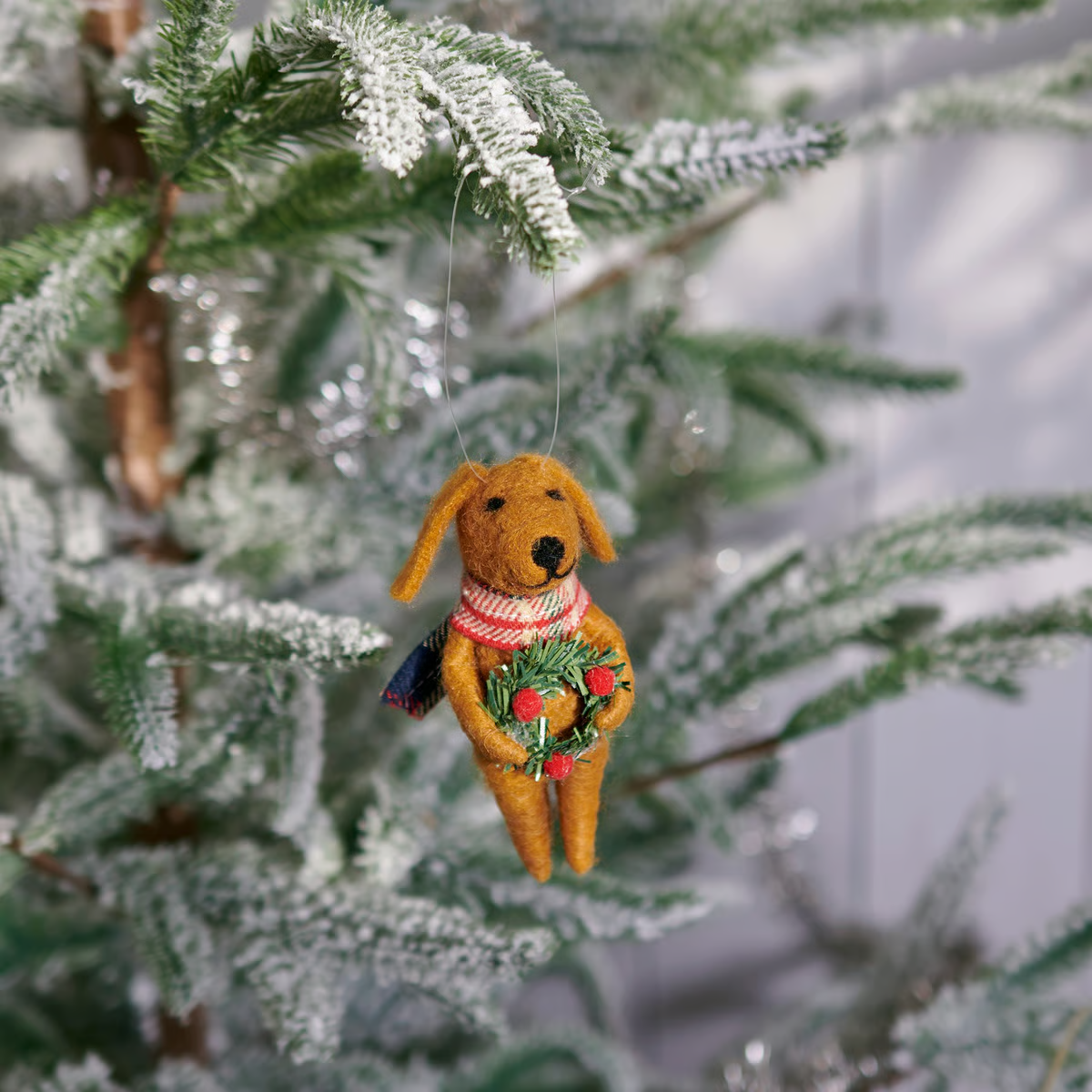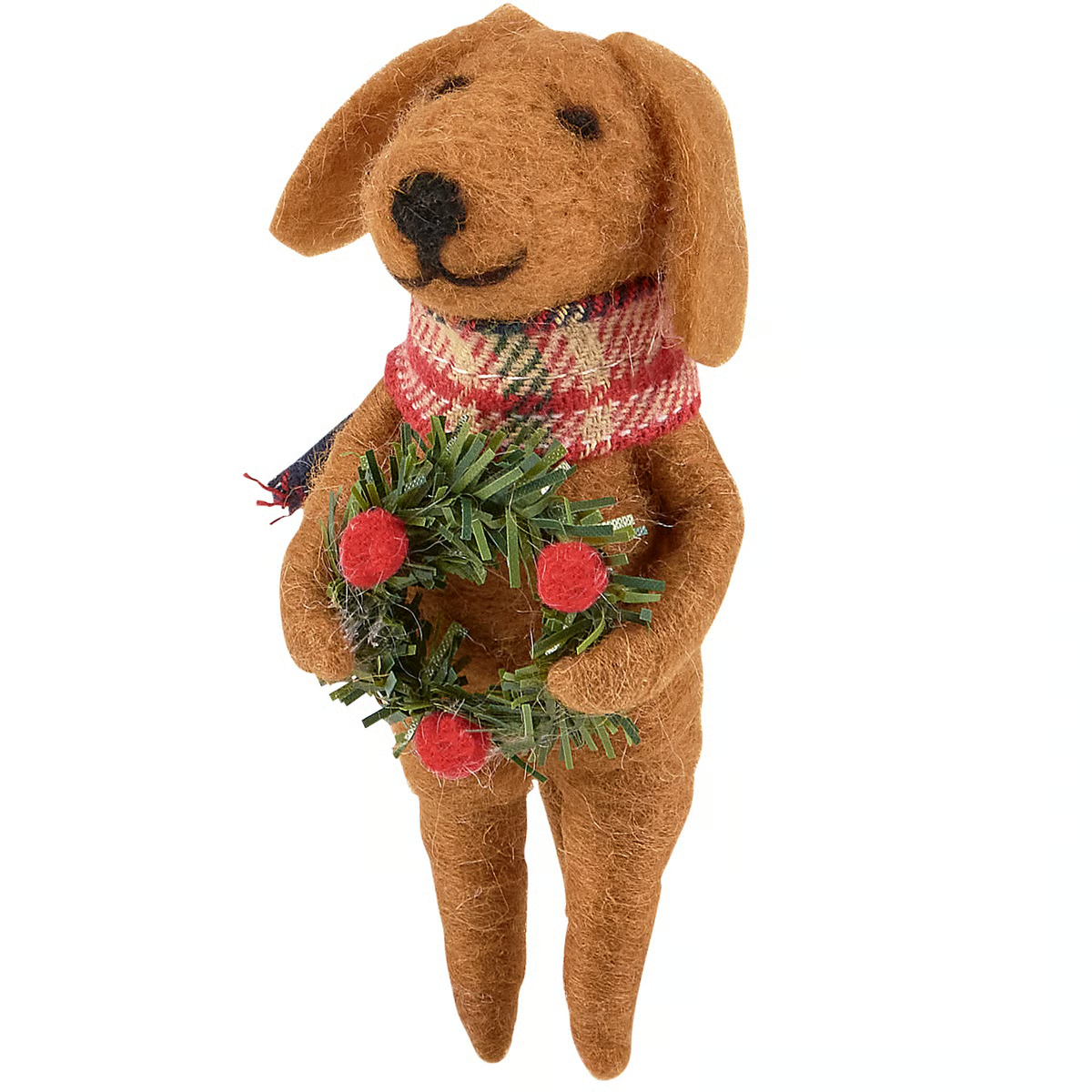 A felt critter displaying a standing dog holding a holiday wreath that coordinates well with décor from our Christmas Collection. Dog critter features cute accents including a festive plaid scarf and felt berry details on the wreath. Our Wreath Dog critter is designed to hang for display via included hanger.