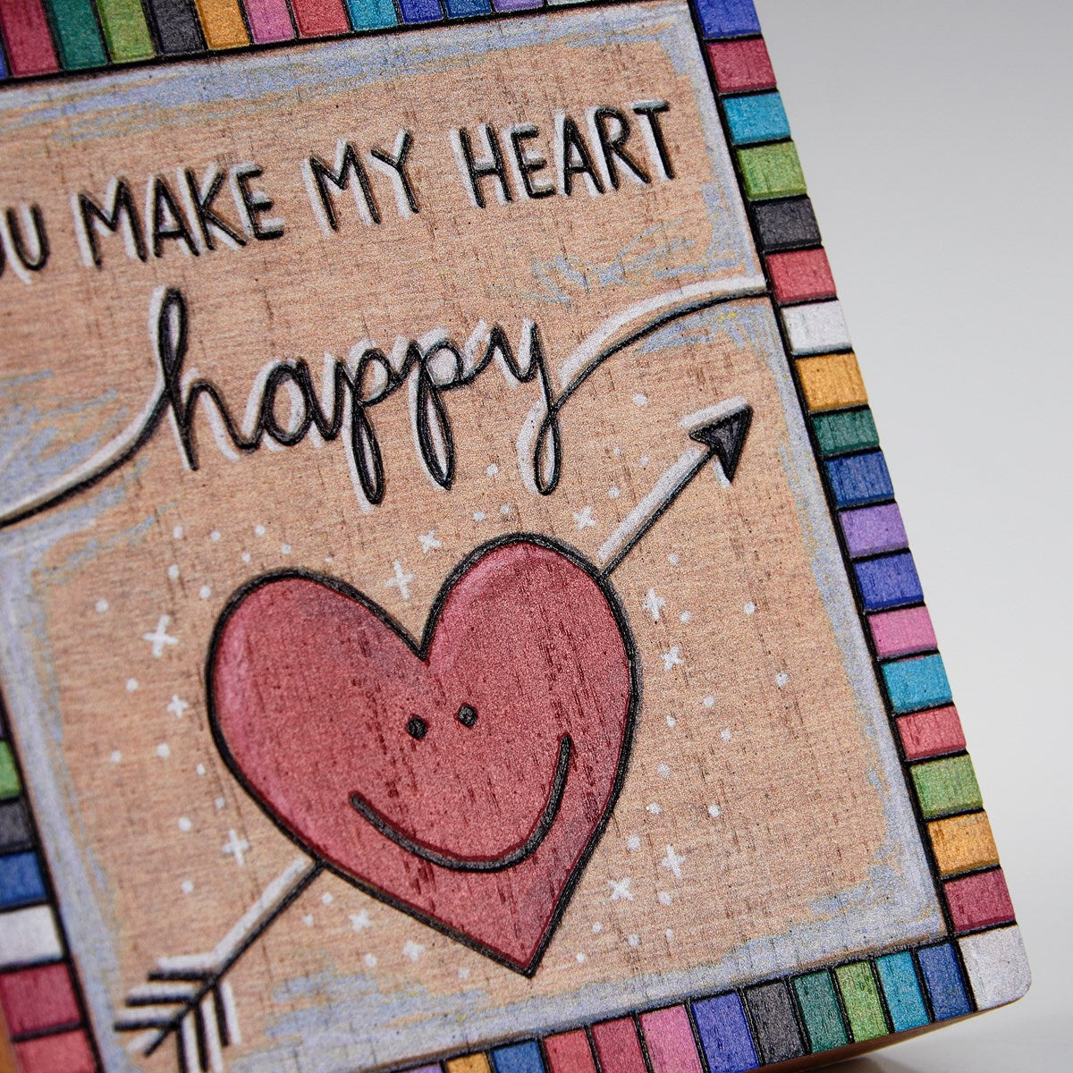A wooden block sign from our Wood Burning Collection displaying a vibrant hand illustrated design of a heart with happy face inside and arrow through it under a heartwarming sentiment that reads "You Make My Heart Happy." Block sign features wood burned details for added texture with coordinating natural wood on the sides and back. Our Heart Happy block sign is easy to hang via predrilled keyhole slot or can free-stand alone. A lovely everyday home accent perfect for gifting.