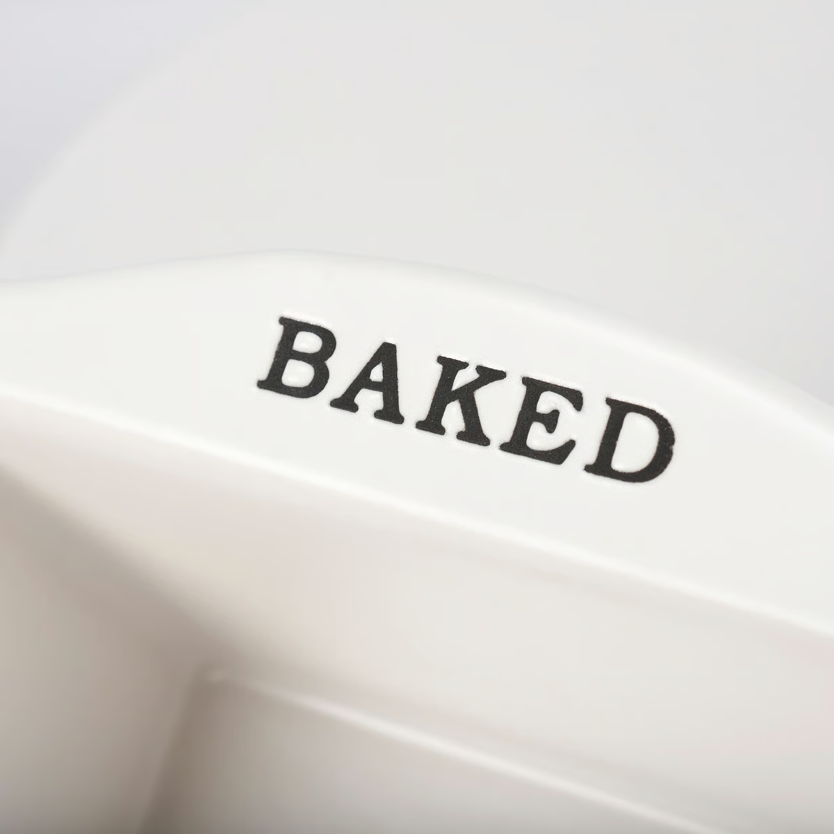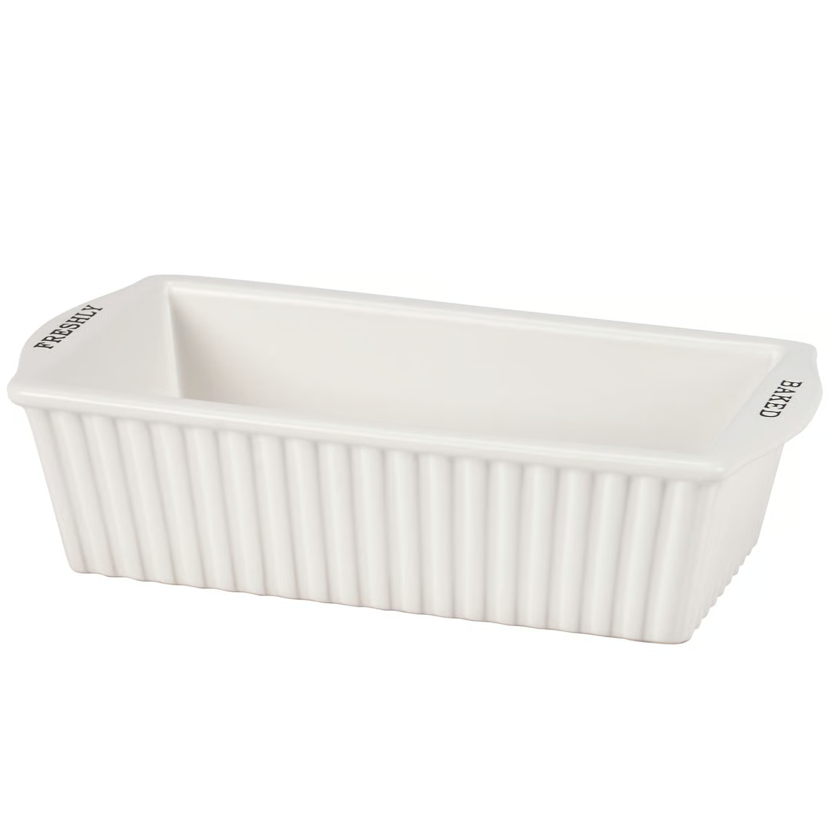 A stoneware loaf pan from our Tabletop Collection displaying a simple and clean white design with a fun food-themed sentiment on the handles that reads "Freshly Baked." Sentiment is debossed for added detail. Our Freshly Baked loaf pan is conveniently microwave, oven, dishwasher, and food safe for easy use. A fun piece of rustic tableware perfect for everyday or seasonal gatherings.