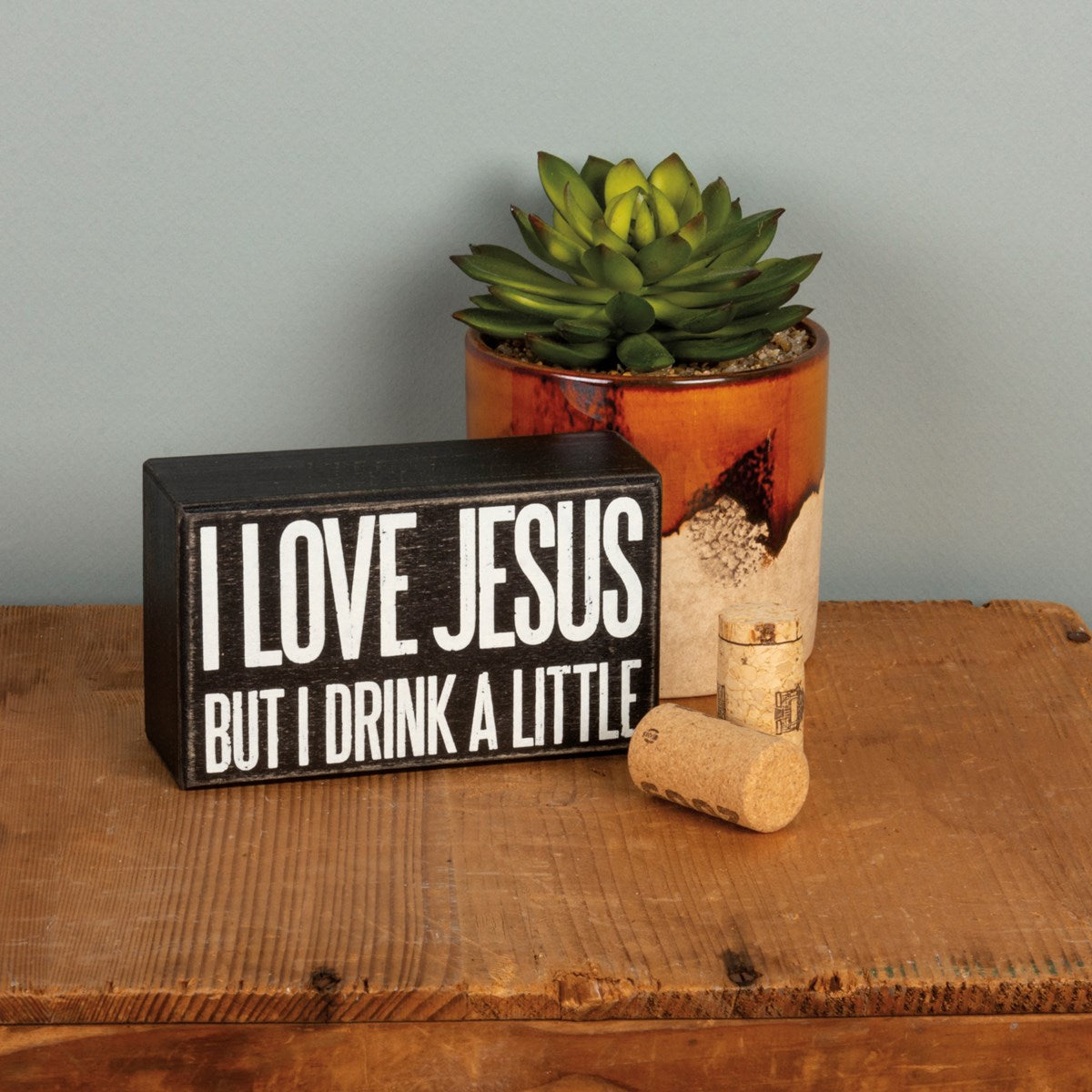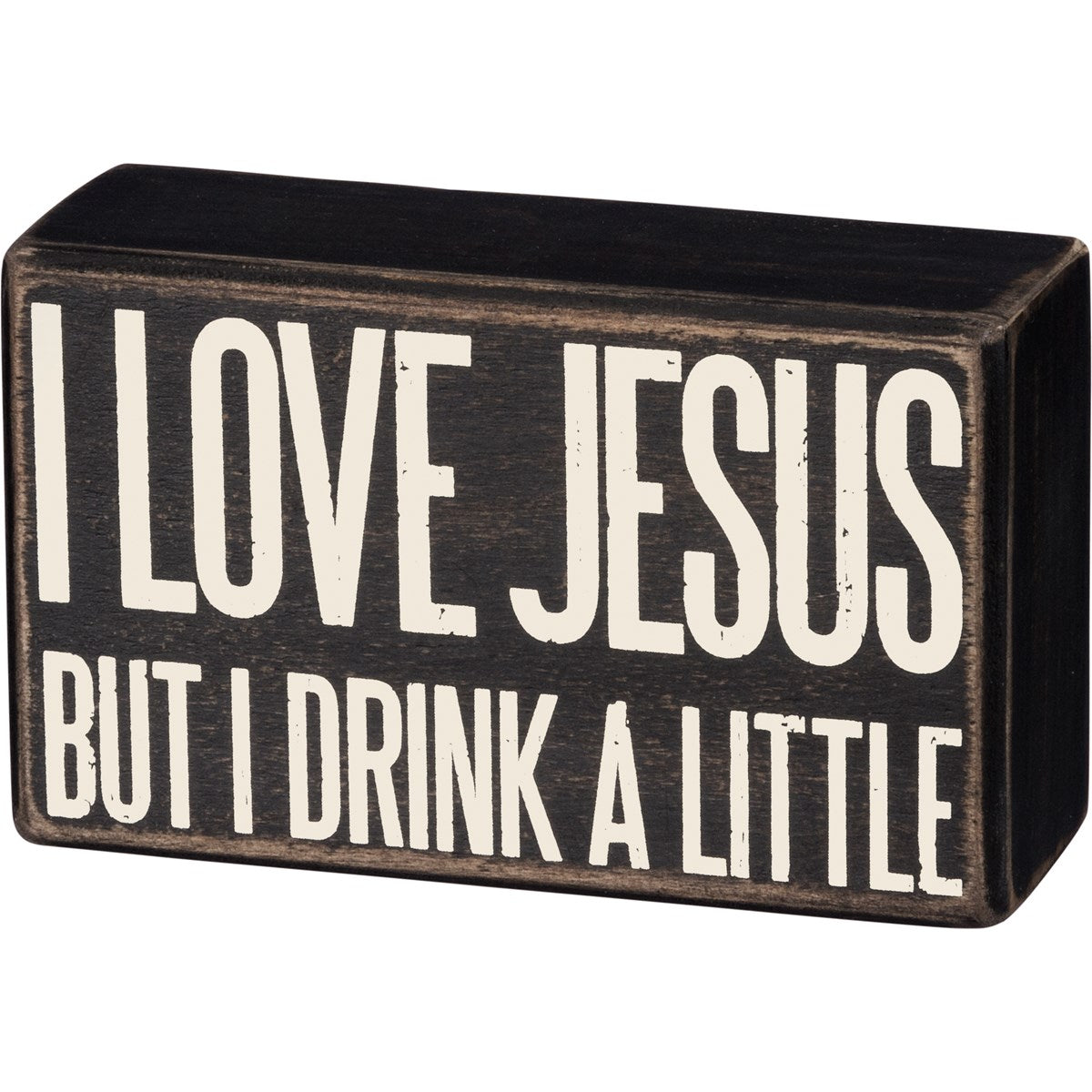 A classic black and white wooden box sign featuring a distressed "I Love Jesus - But I Drink A Little" sentiment. Easy to hang or can free-stand alone.