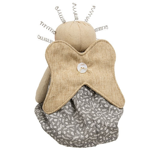 Hope the Inspirational Angel Doll is a charming country accent perfect for springtime or everyday decor. Finished with neutral canvas, the doll has a weighted body, round head, floppy arms, and dangling legs. A pair of angel wings are attached to her back with a pearlescent button. Spiral wire curls adorn the angel's head, while painted eyes and flushed cheeks give a friendly look. The doll wears a blue-gray floral flour sack dress secured with a pearlescent button and accented by a brown paper tag that reads, "hope.".