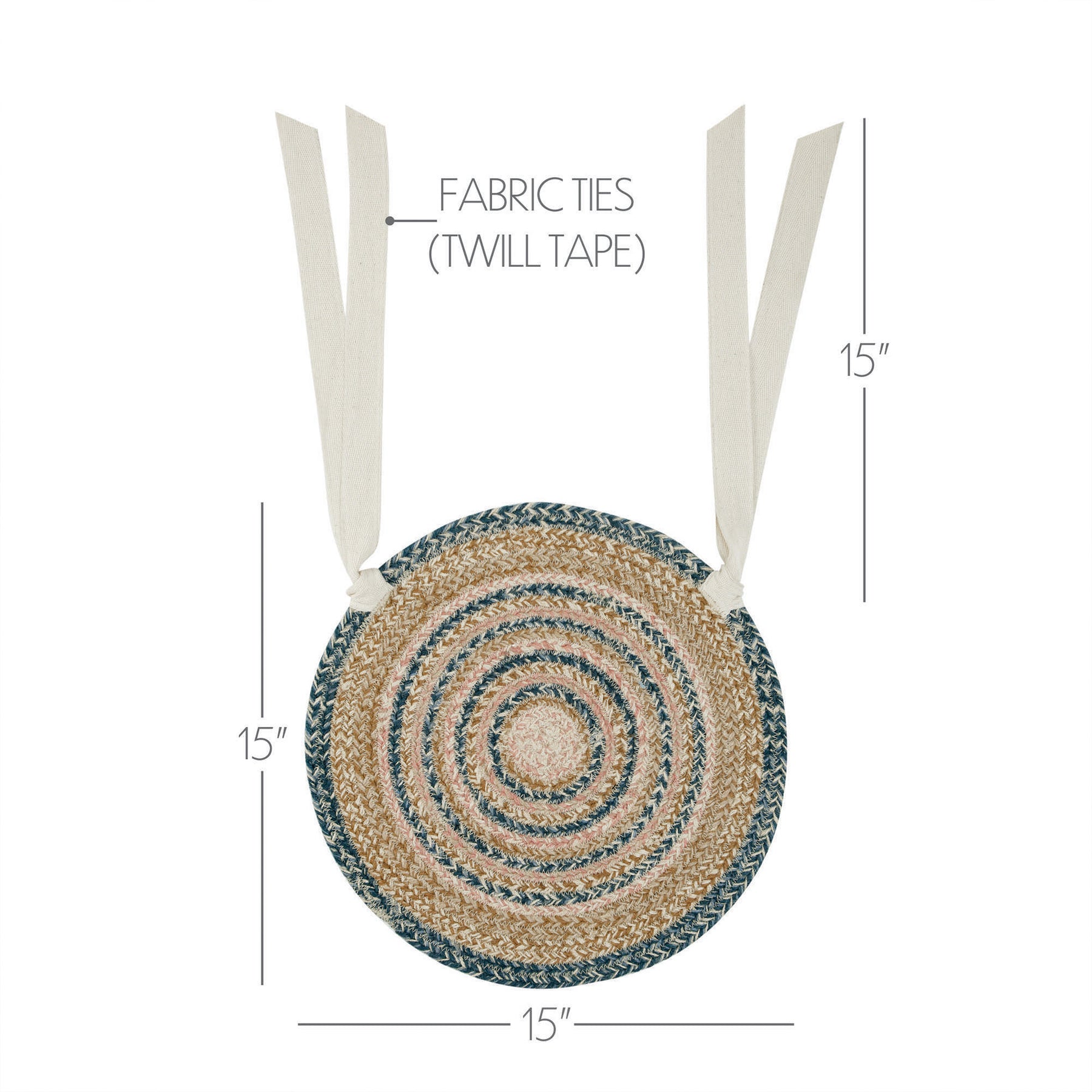 Bring warmth and cheer to your kitchen with braided jute in coastal blues, misty rose and golden tan. The Kaila Jute Chair Pad is a durable 15 inch round chair cushion with long ties to easily add a pop of rustic country style to a wide variety of seating. This round seat pad features an 80 percent jute blend that lays flat easily for natural texture and style while offering your chair protection from damage. Spot clean as needed. To give your kitchen or tabletop a complete look, pair with other items from the Kaila Collection including farmhouse placemats, table runners and more for a deeply inviting, feels-like-home dining space.