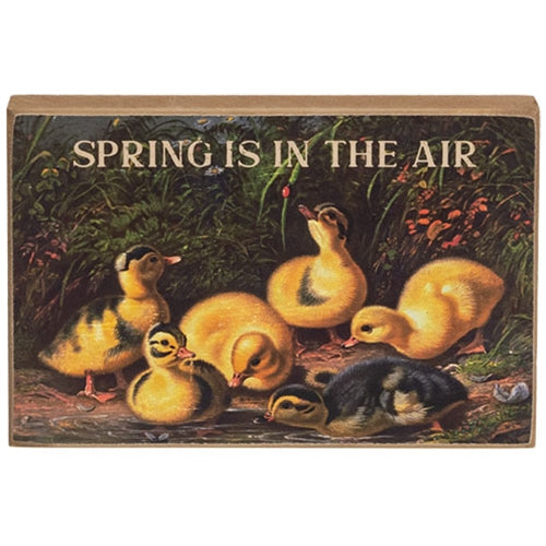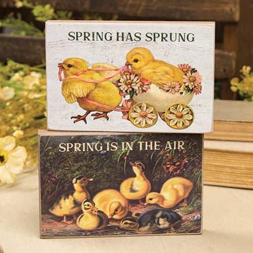 Spring Has Sprung Vintage Chick Blocks are an assortment of wooden blocks to complete seasonal spring decor. Both blocks feature a lightly distressed finish with raw edges for a vintage farmhouse look. One block depicts baby ducks in and around a pond, accented by text that reads, "spring is in the air." One block depicts one baby chick pulling another in a floral cart on a white woodgrain background, and text that reads, "spring has sprung." Each block offers a variety of display options with a flat, freestanding base and two keyhole hangers.