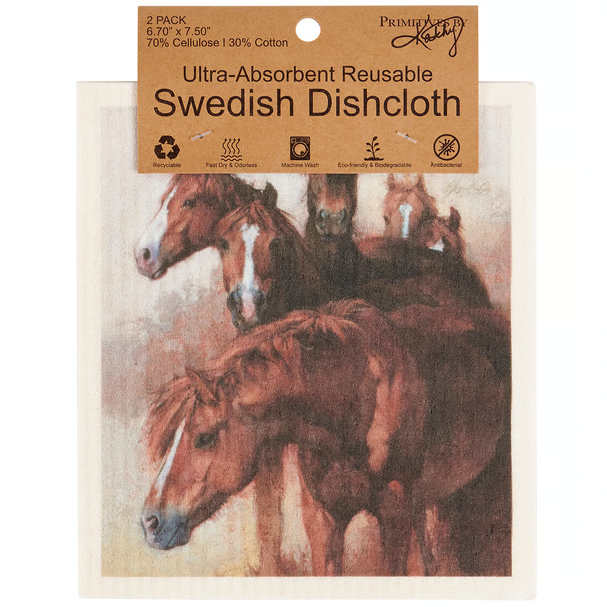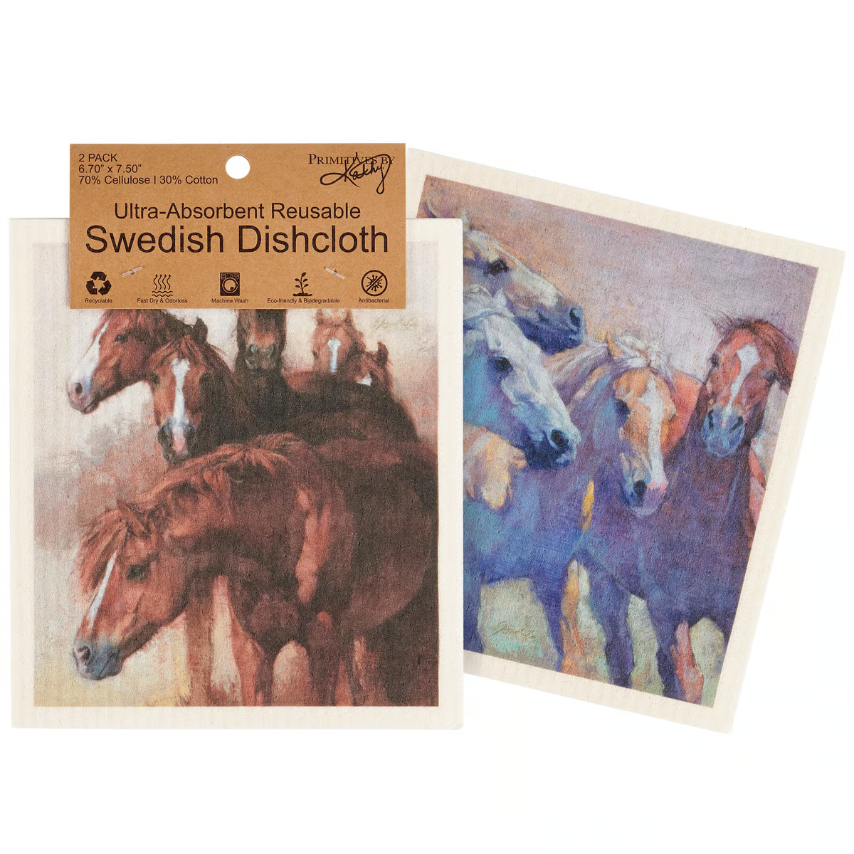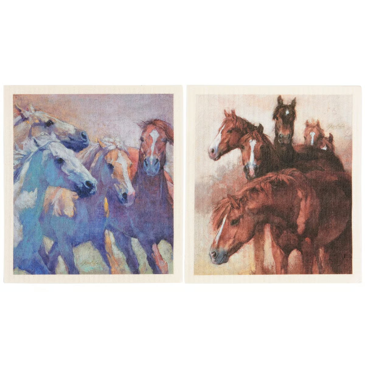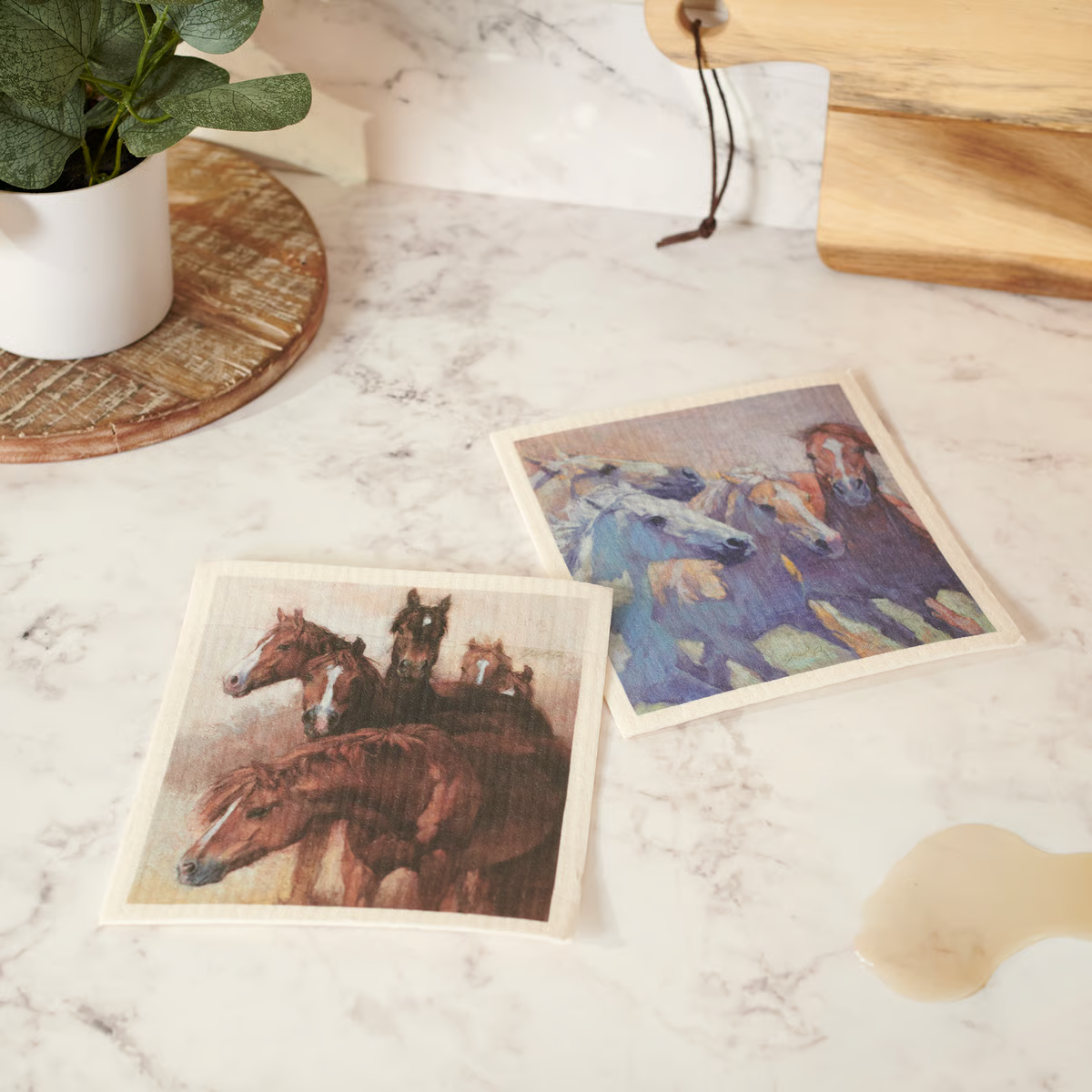 Safe to use on all types of surfaces, eco-friendly Swedish Dishcloths dry quickly and are antibacterial for more hygienic cleaning with reduced waste. This set of 2 Swedish Dishcloths from our Western Collection features calming scenes of wild horses on each. Horse designs are replicated from original hand painted artwork for added texture. Our Wild Horses Swedish cloth set is ultra-absorbent and conveniently machine-washable for easy cleaning and reuse.
