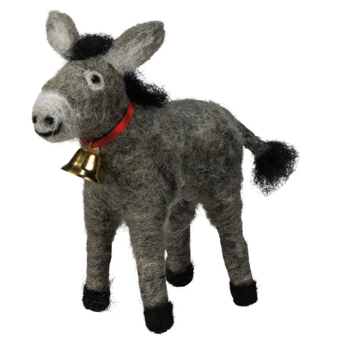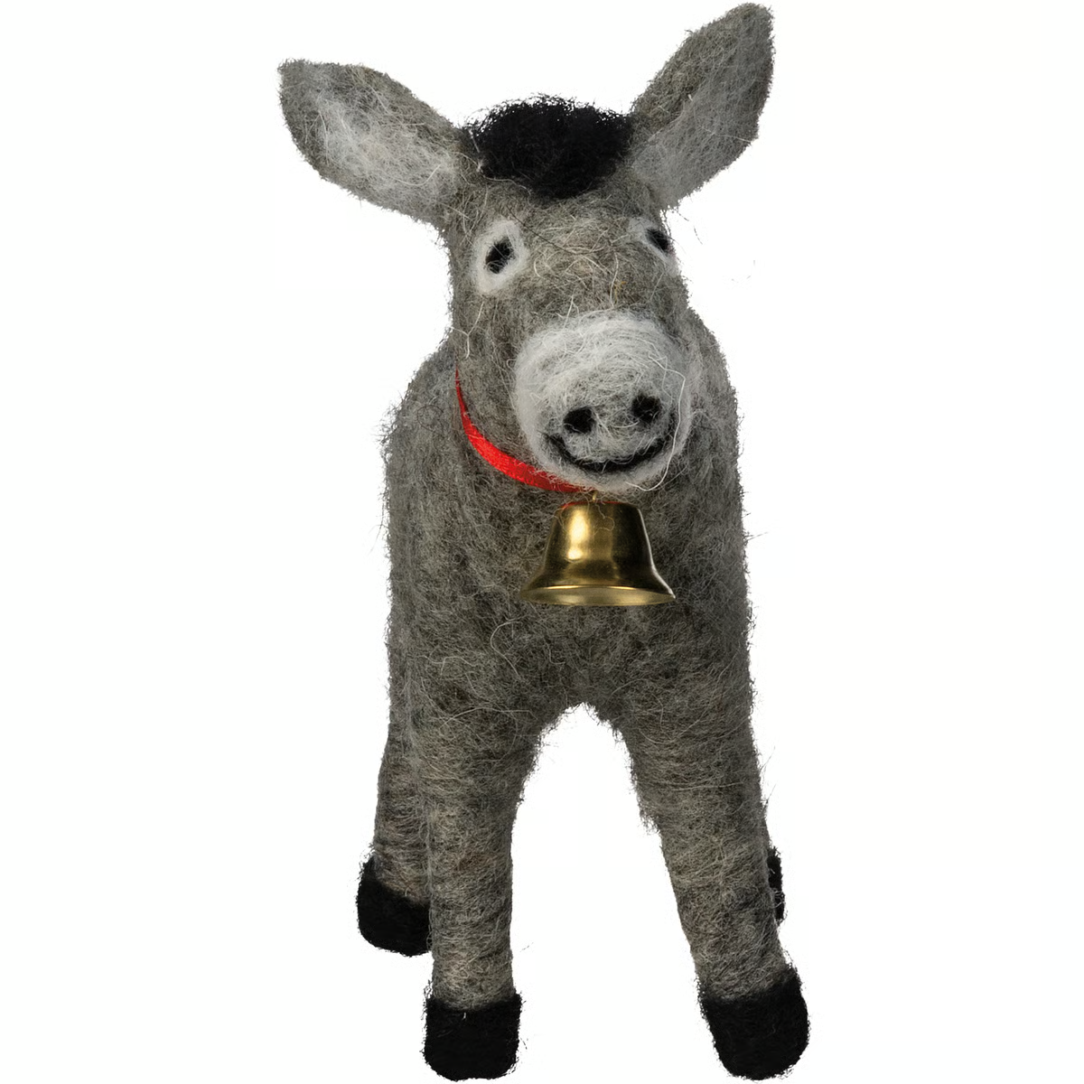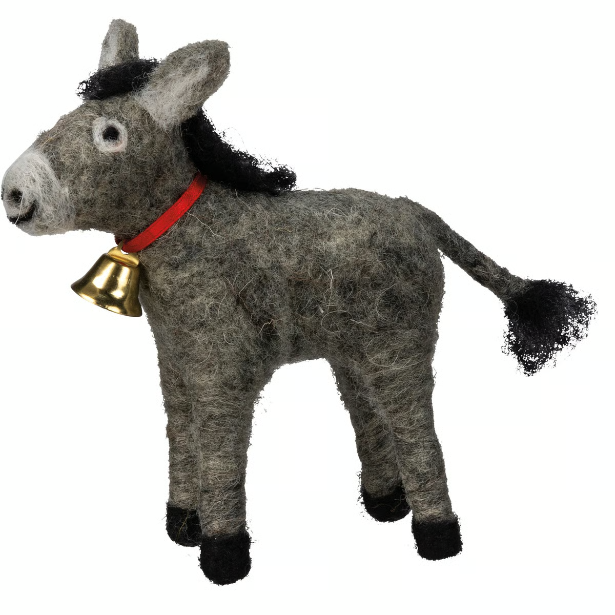 This adorable felt donkey critter brings rustic charm to your holiday or everyday displays. Crafted from soft grey felt with black accents, it features a cute red ribbon collar and gold bell. Perfect for nativity scenes, shelf styling, or gifting to animal lovers for a sweet farmhouse touch.