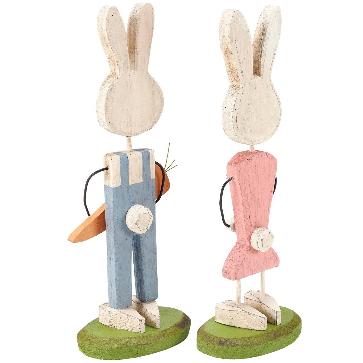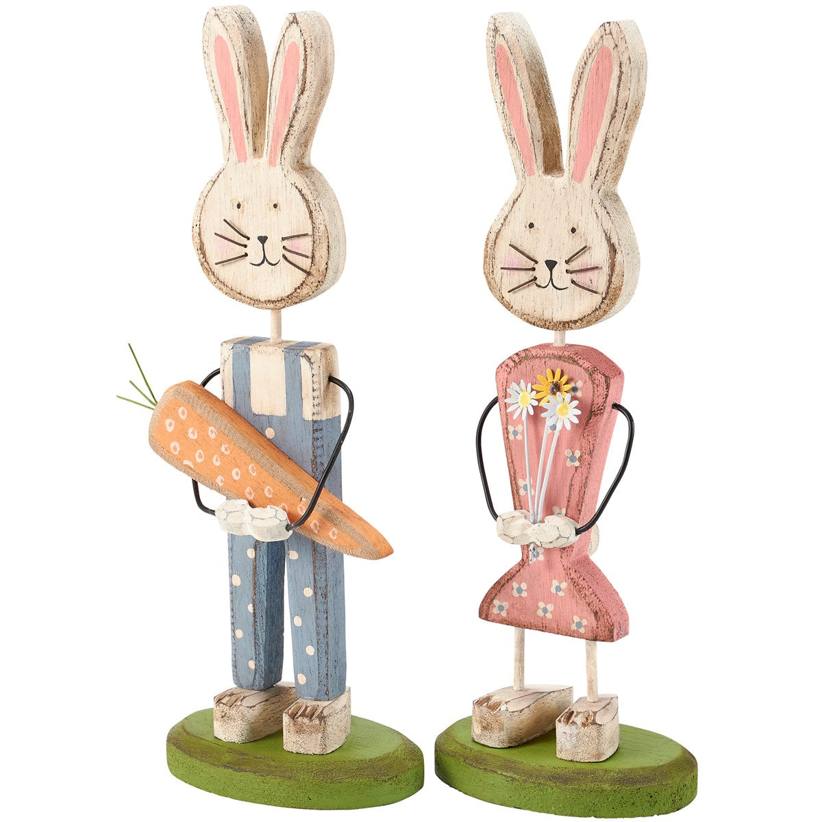 A set of two wooden sitters displaying delightful bunny designs on grass green wooden bases. Designs include a bunny wearing polka dot overalls and holding a large carrot as well as a bunny wearing a flower dress and holding spring flowers. Bunnies are recreated from an original hand carved and painted piece with distressed details. Sitters feature wire and painted accents to create a handmade feel. Our Bunny Couple stand up set is designed to free-stand alone on flat surface. A set of fun seasonal home accents that adds character to any display.