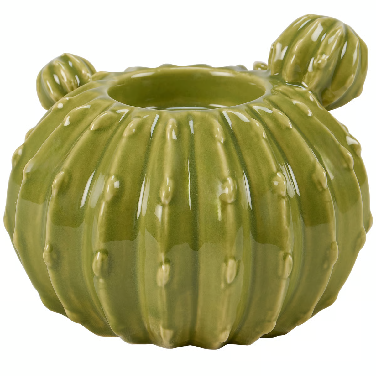 A ceramic candle holder features a green glaze base with sculpted cactus design and center slot for a single candle. Our Cactus candle holder fits a standard tealight candle and can free-stand on flat surface. Candle pictured not included.