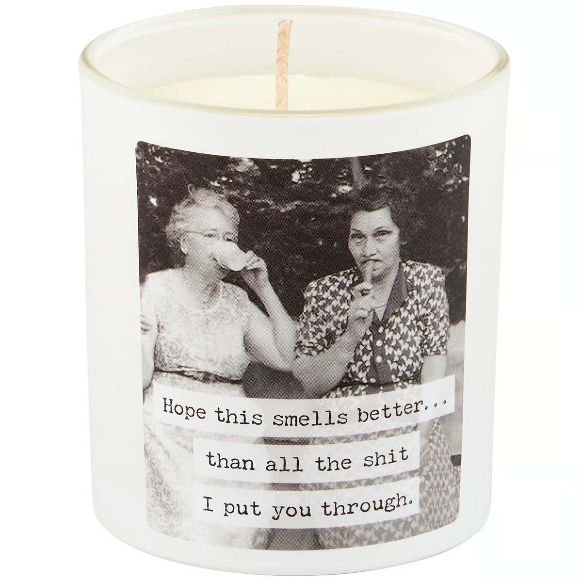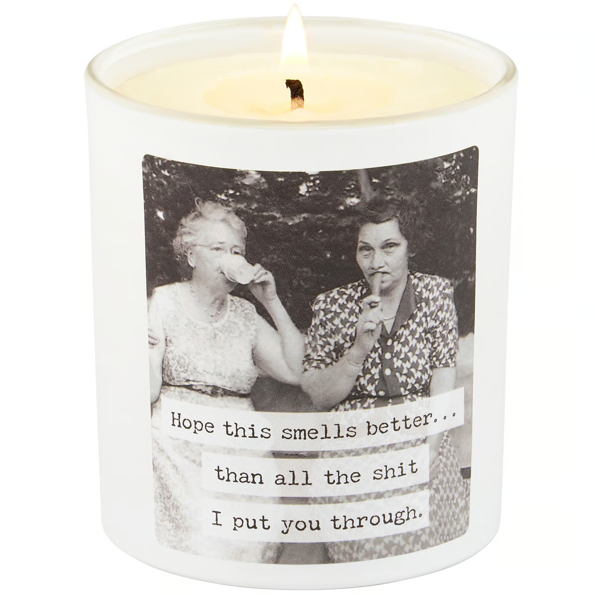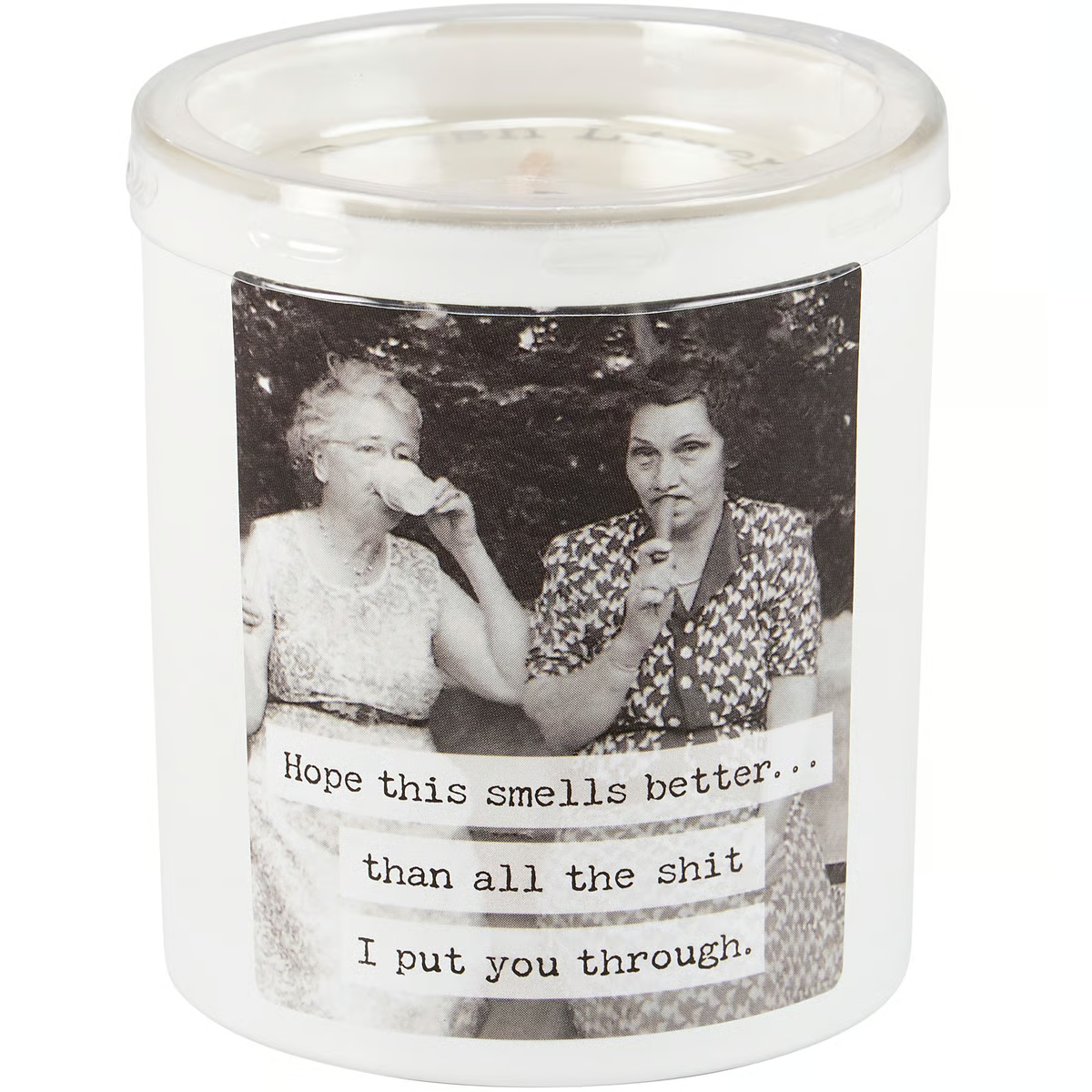 A jar candle displaying a double-sided design of a vintage black and white photograph on frosted white glass complemented with a humorous sentiment that reads "Hope This Smells Better... Than All The Shit I Put You Through." Candle features soy-based wax and cotton wick with 35 hours of burn time activating a calming Fresh Linen scent. Our Smells Better jar candle includes a dust cover and plastic lid for protection and polished appearance. A hilarious home accent that is great for everyday gifting.