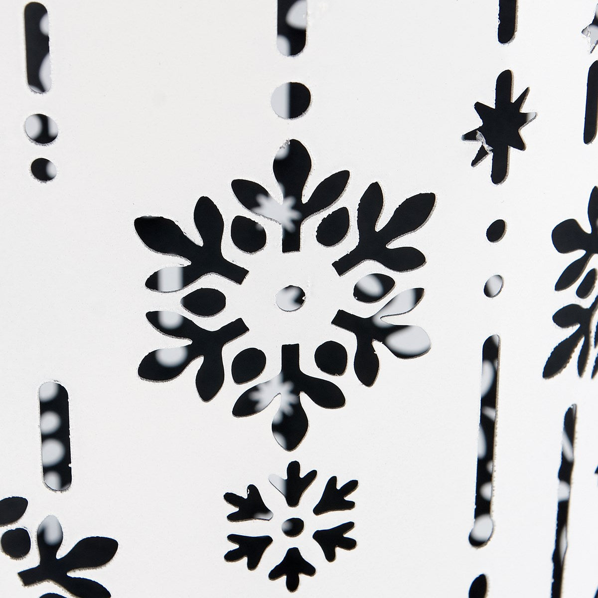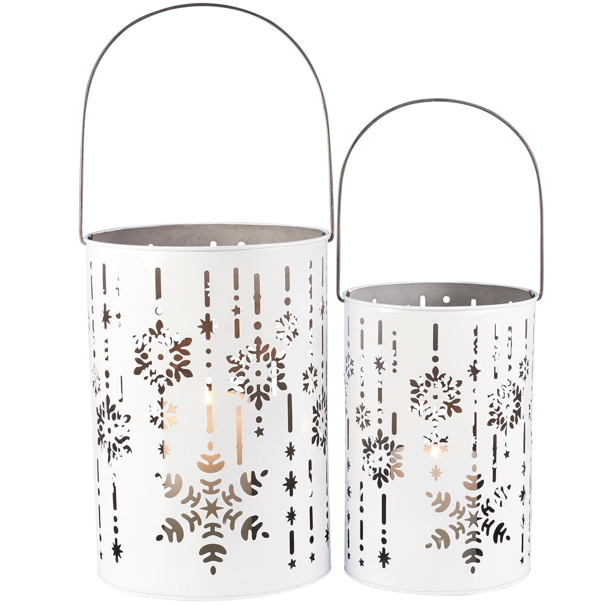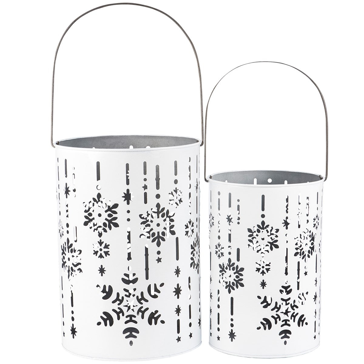A set of metal lanterns from our Christmas Collection displaying wrap-around snowflake designs with white paint finish. Lanterns include space inside to place various light sources and features cutout details to illuminate snowflake designs. Candles pictured not included. Set includes two different size lanterns that can nest inside each other for easy storage. Our Snowflakes lantern set includes metal wire handles to carry or hang for display. A rustic seasonal home accent with a variety of display options