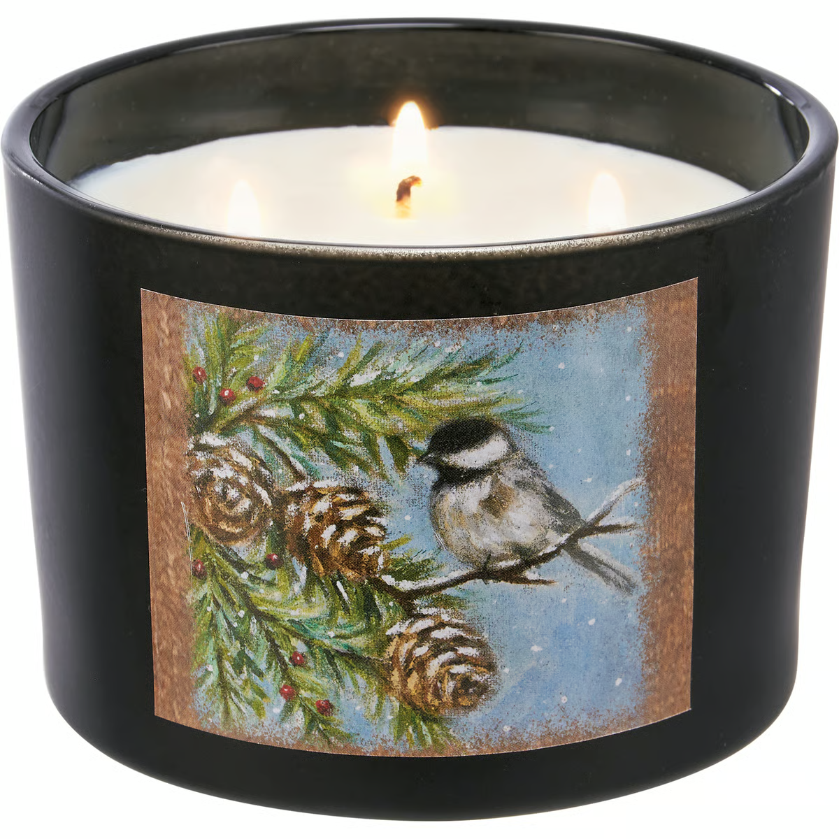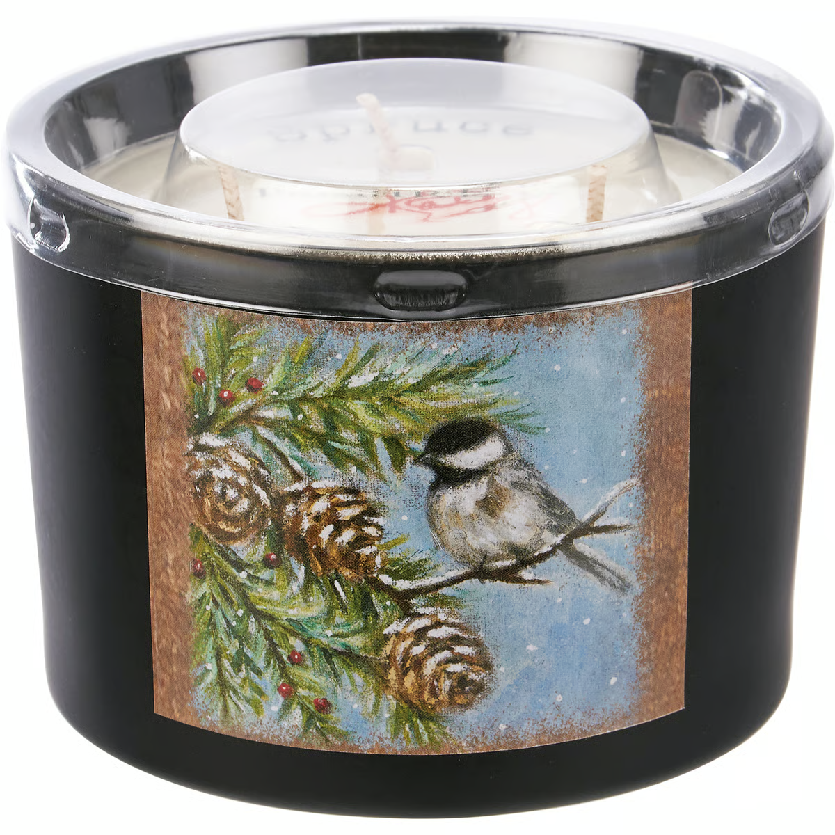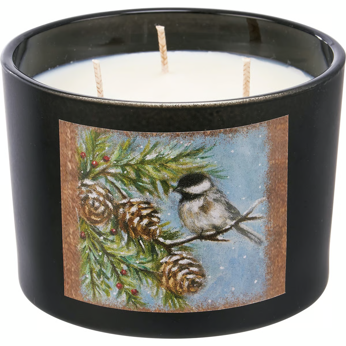 A jar candle from our Christmas Collection displaying a double-sided design of a chickadee in a snowy woodland on black matte jar. Design is replicated from original artwork painted onto burlap canvas, giving the art a unique depth and texture. Candle features soy-based wax and 3 fabric wicks with 30 hours of burn time activating a refreshing Spruce scent. Our chickadee candle includes dust cover and plastic lid for protection and polished appearance.