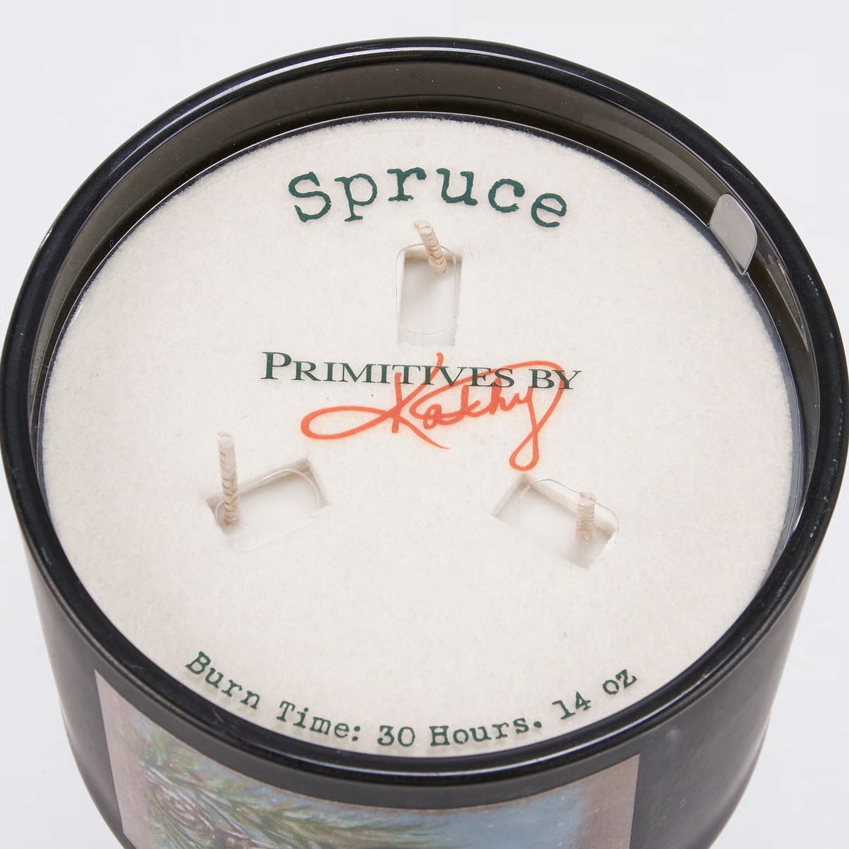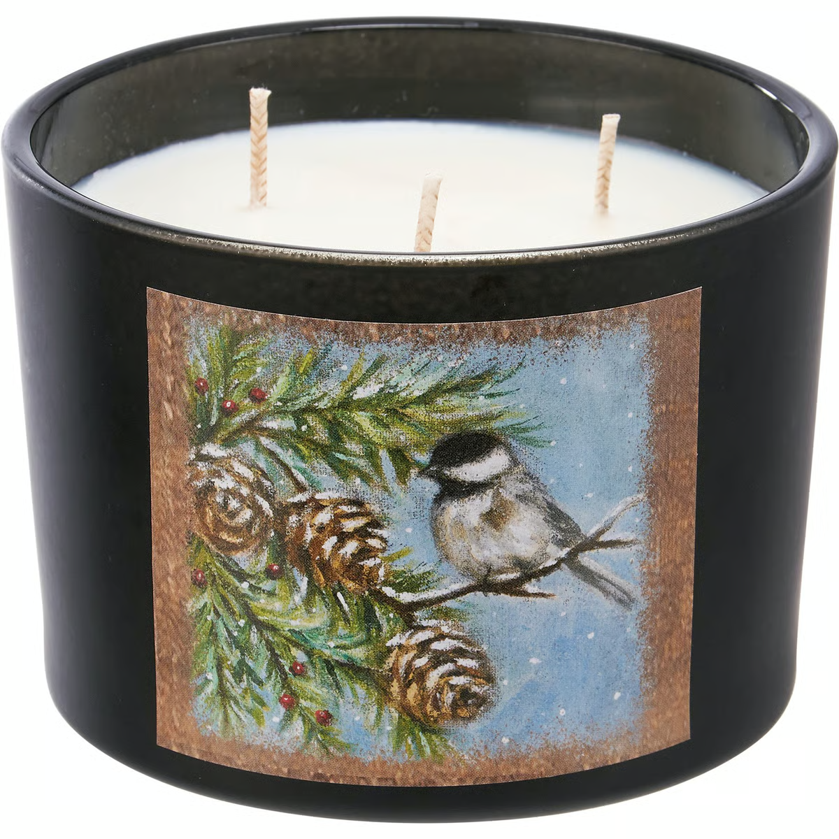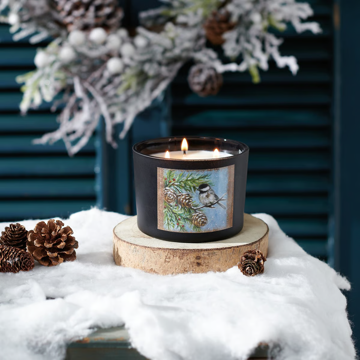 A jar candle from our Christmas Collection displaying a double-sided design of a chickadee in a snowy woodland on black matte jar. Design is replicated from original artwork painted onto burlap canvas, giving the art a unique depth and texture. Candle features soy-based wax and 3 fabric wicks with 30 hours of burn time activating a refreshing Spruce scent. Our chickadee candle includes dust cover and plastic lid for protection and polished appearance.