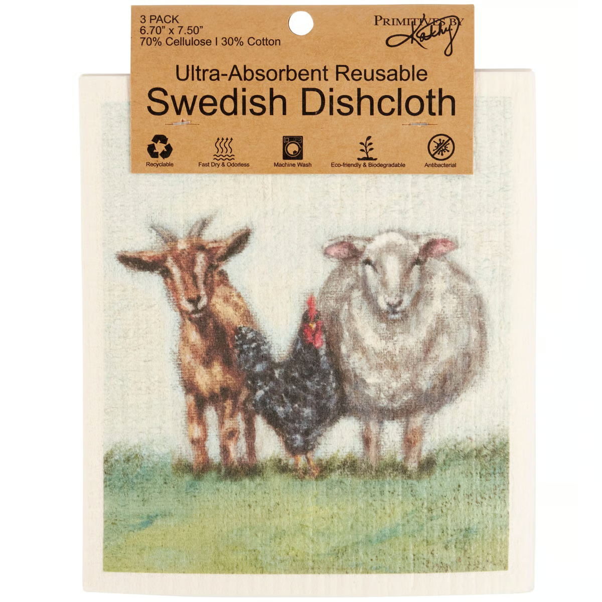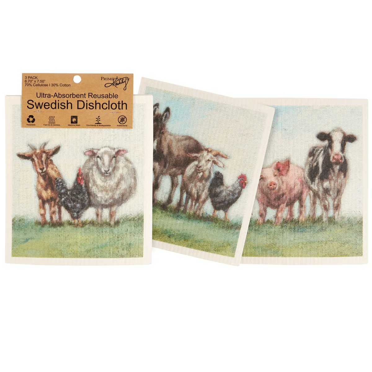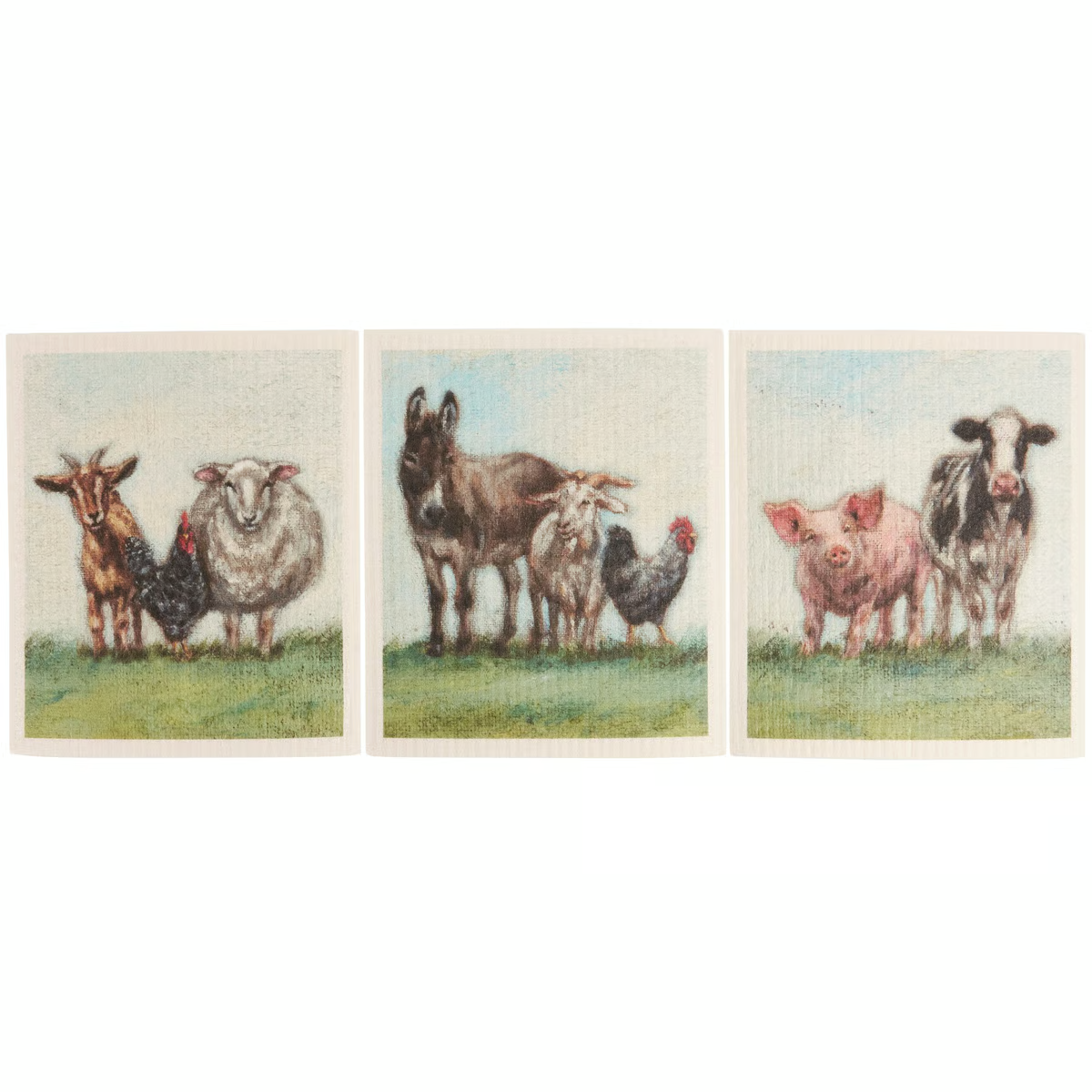 Safe to use on all types of surfaces, eco-friendly Swedish Dishcloths dry quickly and are antibacterial for more hygienic cleaning with reduced waste. This set of 3 Swedish Dishcloths from our Farmhouse Collection features charming scenes of farm animals together in a field. Farm animals designs are replicated from original artwork painted onto burlap canvas, giving the art a unique depth and texture. Our Farm Family Swedish cloth set is ultra-absorbent and conveniently machine-washable for easy cleaning and reuse. A rustic farm-themed set of reusable dishcloths perfect for replacing dull sponges and paper towels with long-lasting colorful designs.