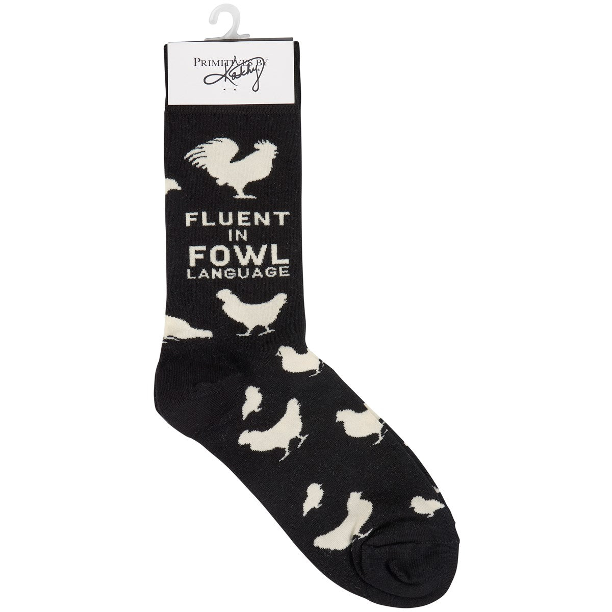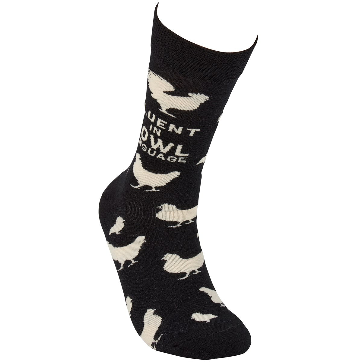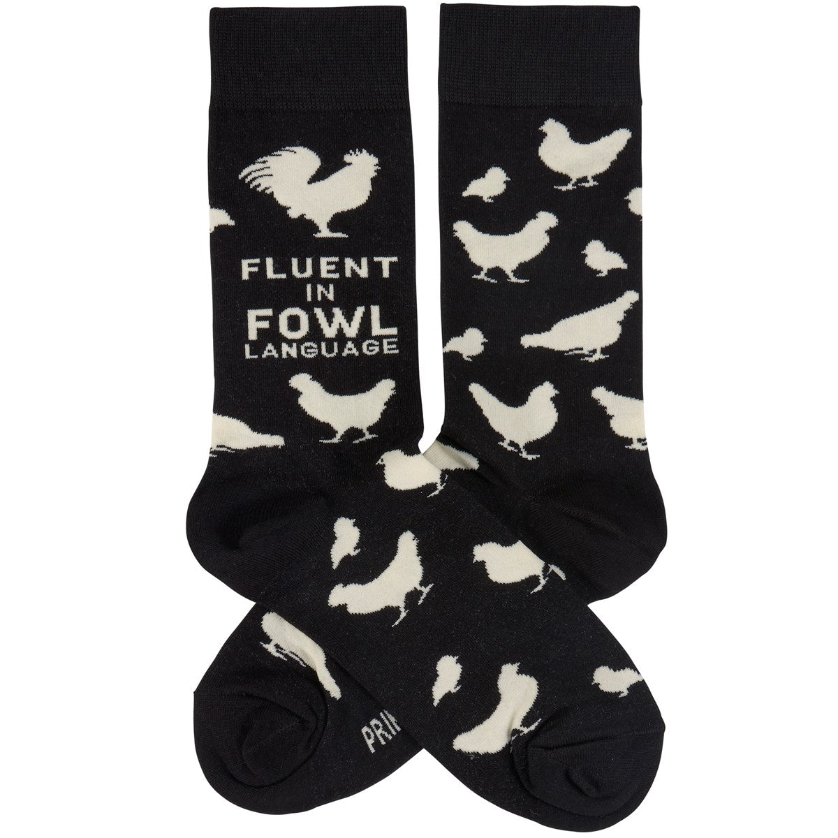 A pair of black and white socks from our Farmhouse Collection displaying various chicken and rooster designs with a farm inspired sentiment that reads "Fluent In Fowl Language." Socks feature a one size fits most design made with cotton, nylon, and spandex.