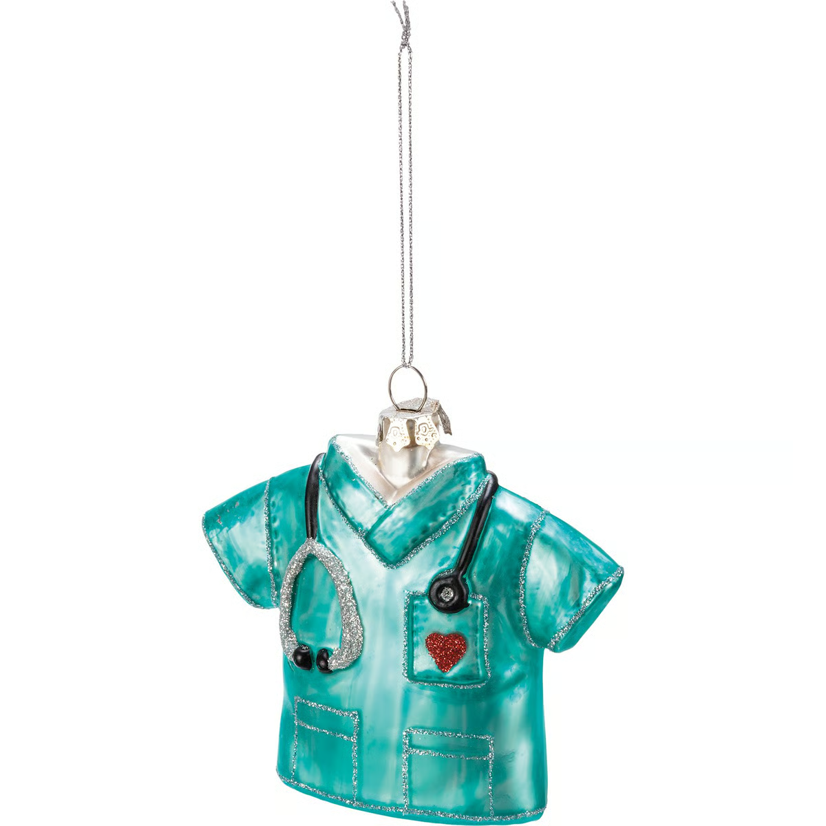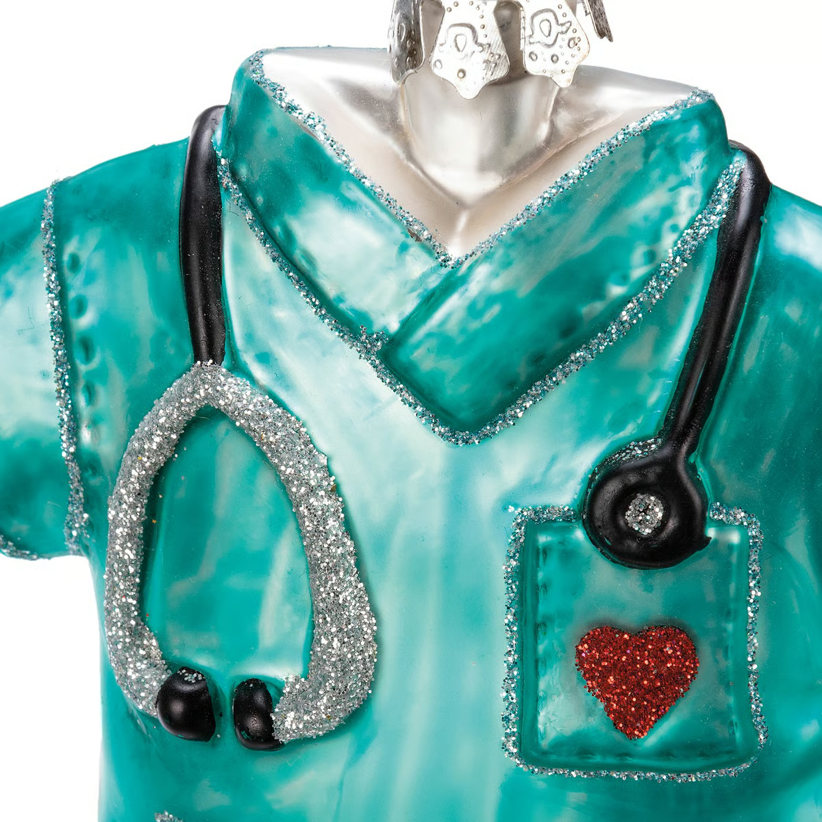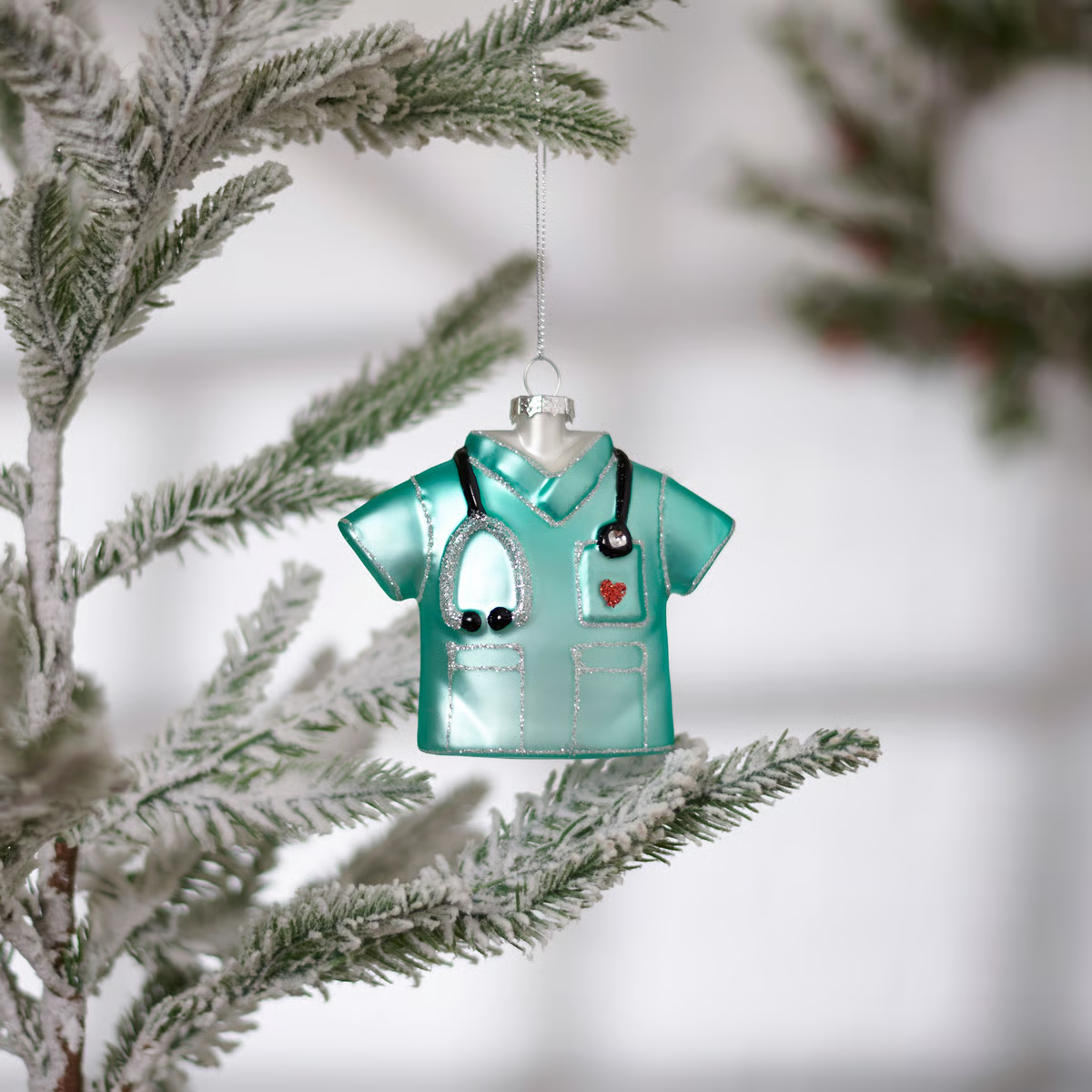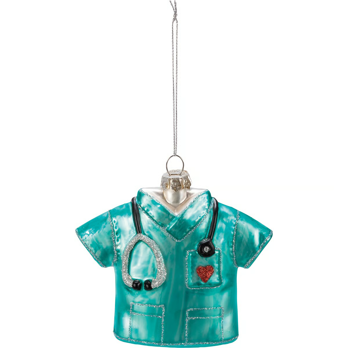 A coated glass nurse scrubs ornament rfom our Nurse Collection feaeturing stethoscope and glitter details for added interest. Our glass Nurse Scrubs ornament contains a metal topper with loop for easy hanging and decorating.