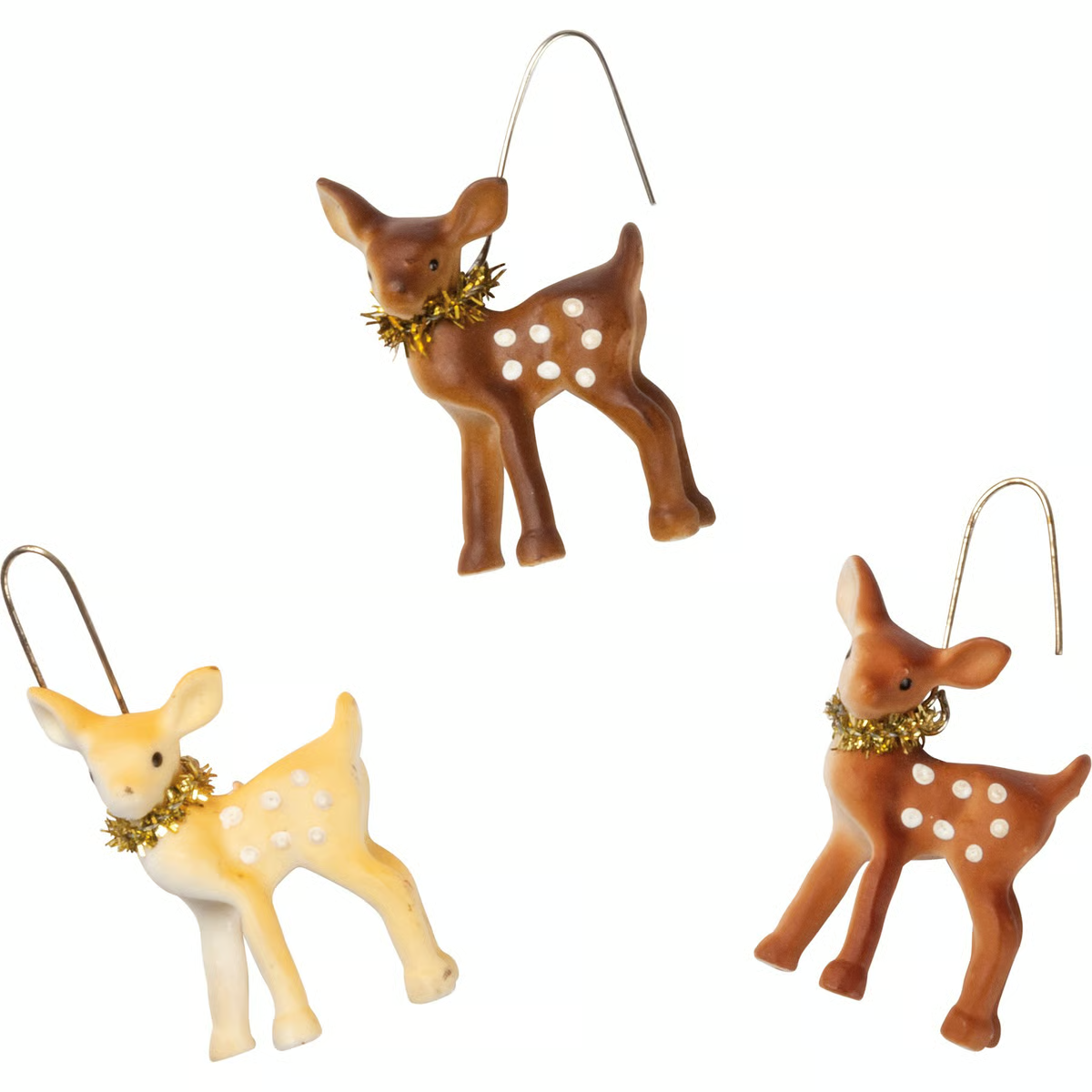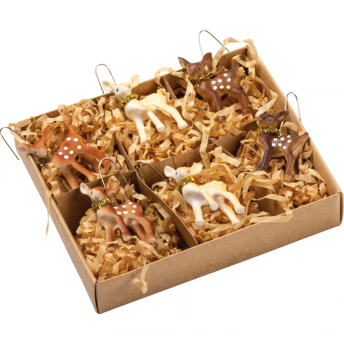 A set of six plastic fawn ornaments featuring tinsel collar accents for added interest, and metal hooks for easy hanging.