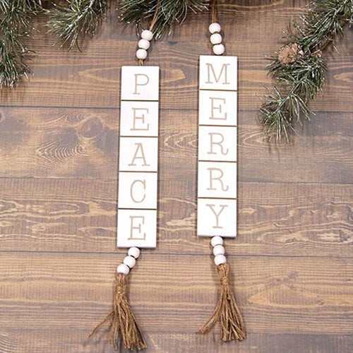 The Peace & Merry Tile Hangers are an assortment of two decorative ornaments made of white wooden tiles. The ornaments are accented with jute tassels, round wooden beads, and read "Peace" or "Merry" across the tile charms. The tops of the ornaments include a jute loop to use for a hanging display on a Christmas tree, knob, or hook in the home.