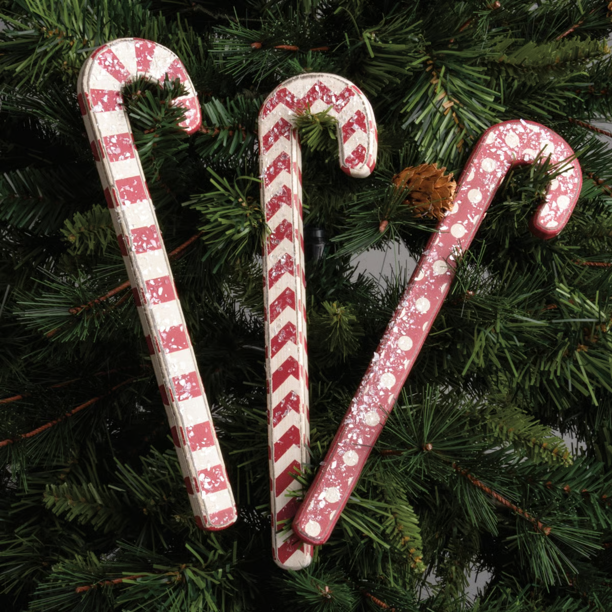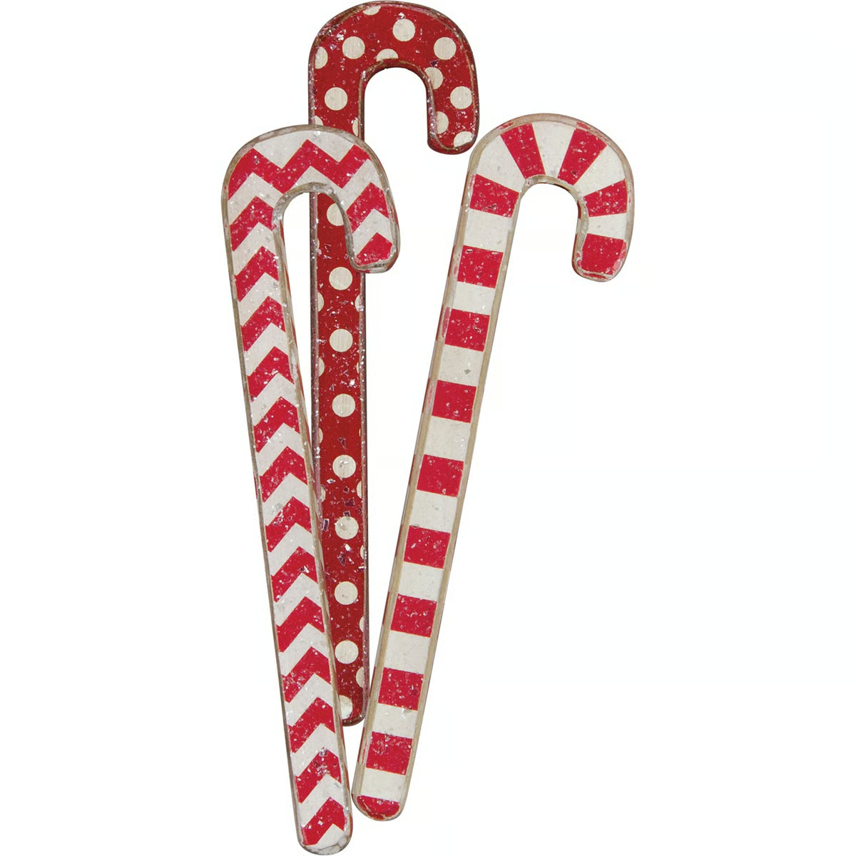 A set of three rustic wooden candy canes with stripe, chevron, and polka dot patterns in a red and white palette. Each piece features mica coating for a snowy effect.