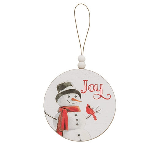The Winter Word Snowman Round Beaded Ornaments are wooden disc ornaments adorned with 3 assorted vintage-inspired styles. Each ornament features a jute hanger with 2 wooden bead accents for a rustic touch. One ornament features a jute hanger with 2 wooden bead accents for a rustic touch. One ornament shows the smiling face of a snowman alongside red block text that reads, "believe." One ornament shows a snowman holding a cardinal with red block text that reads, "joy." One ornament shows a cardinal and red block text that reads, "merry Christmas."