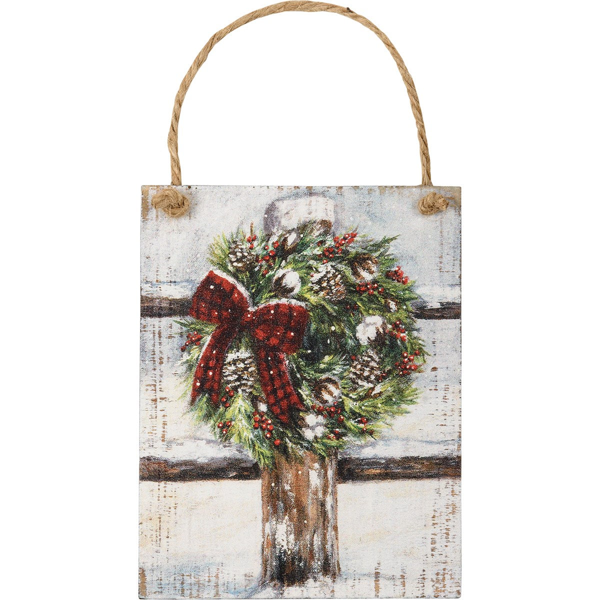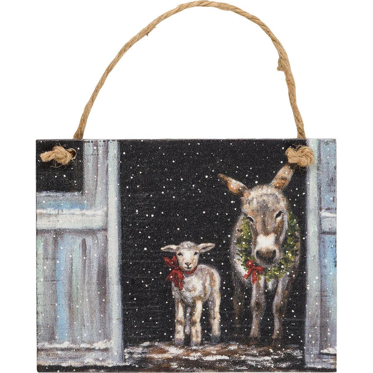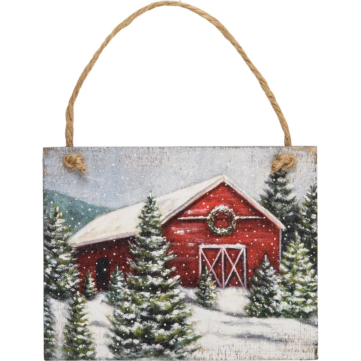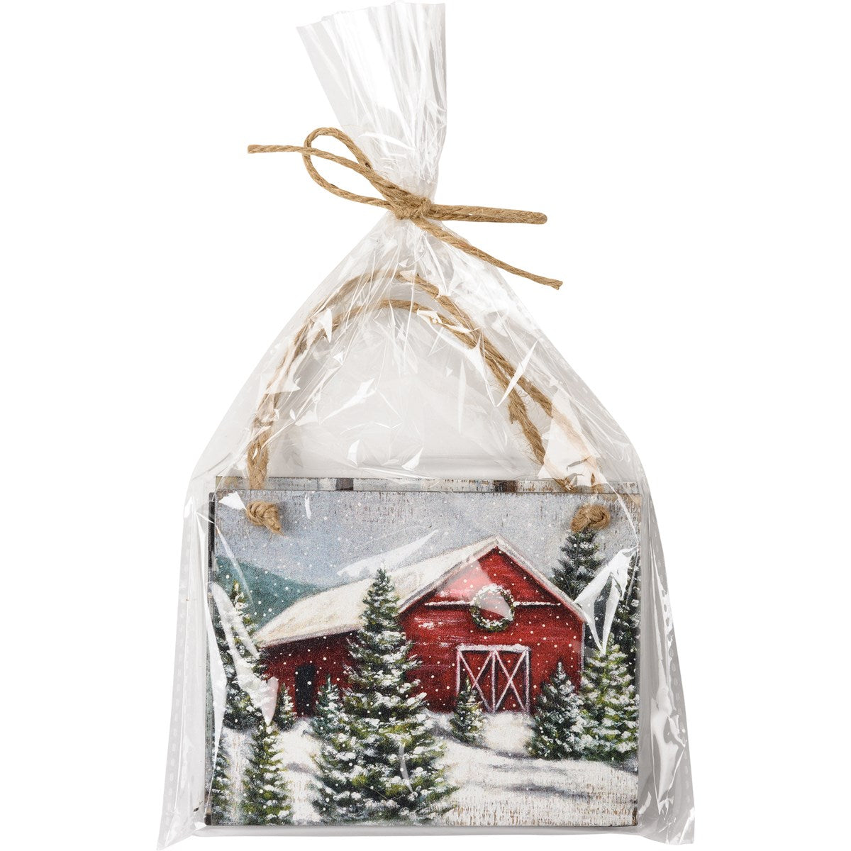 A set of three wooden ornaments featuring wintry farm scene designs. Designs are replicated from original artwork painted onto burlap canvas, giving the art a unique depth and texture. This Wintry Farm Ornament Set hangs via attached jute ribbon.