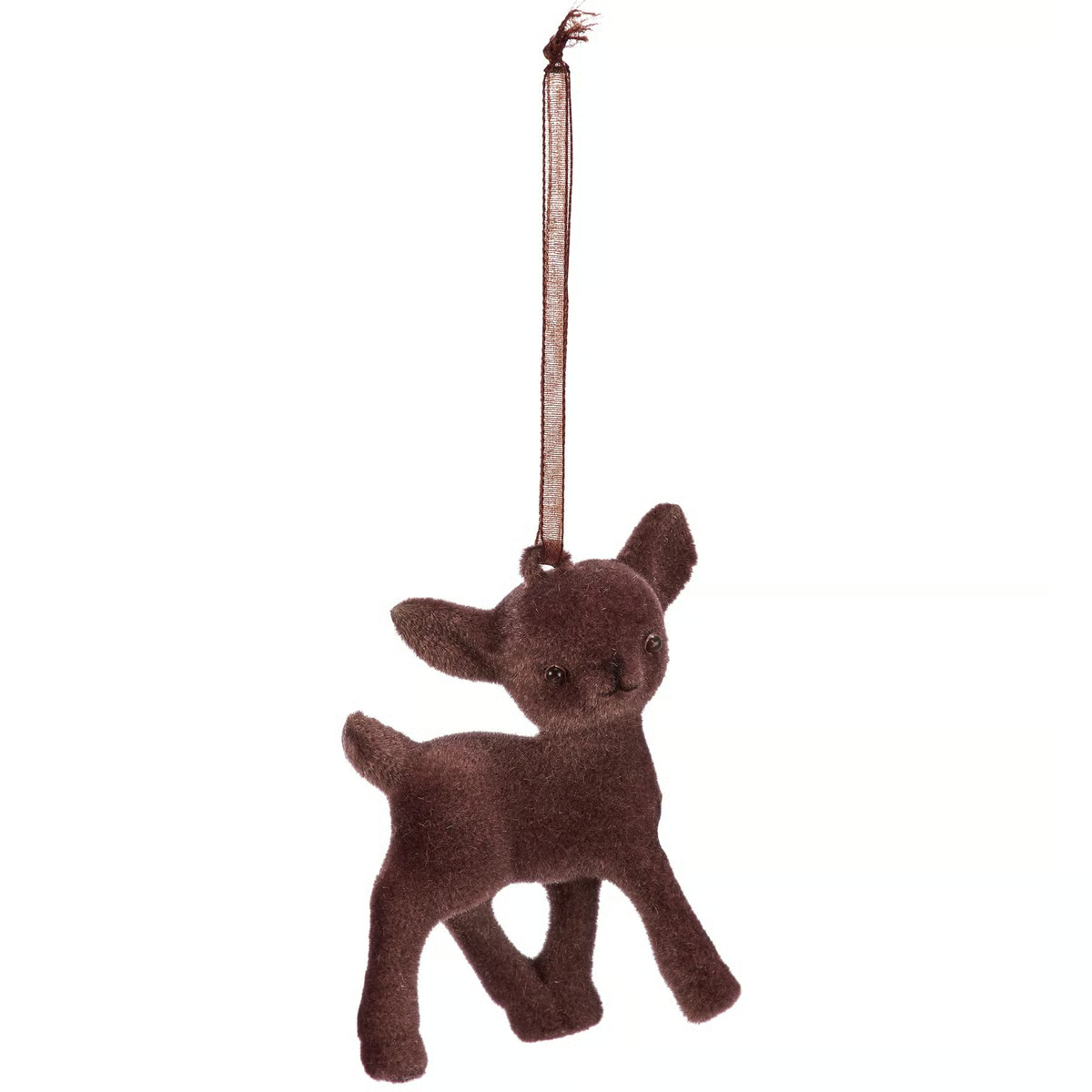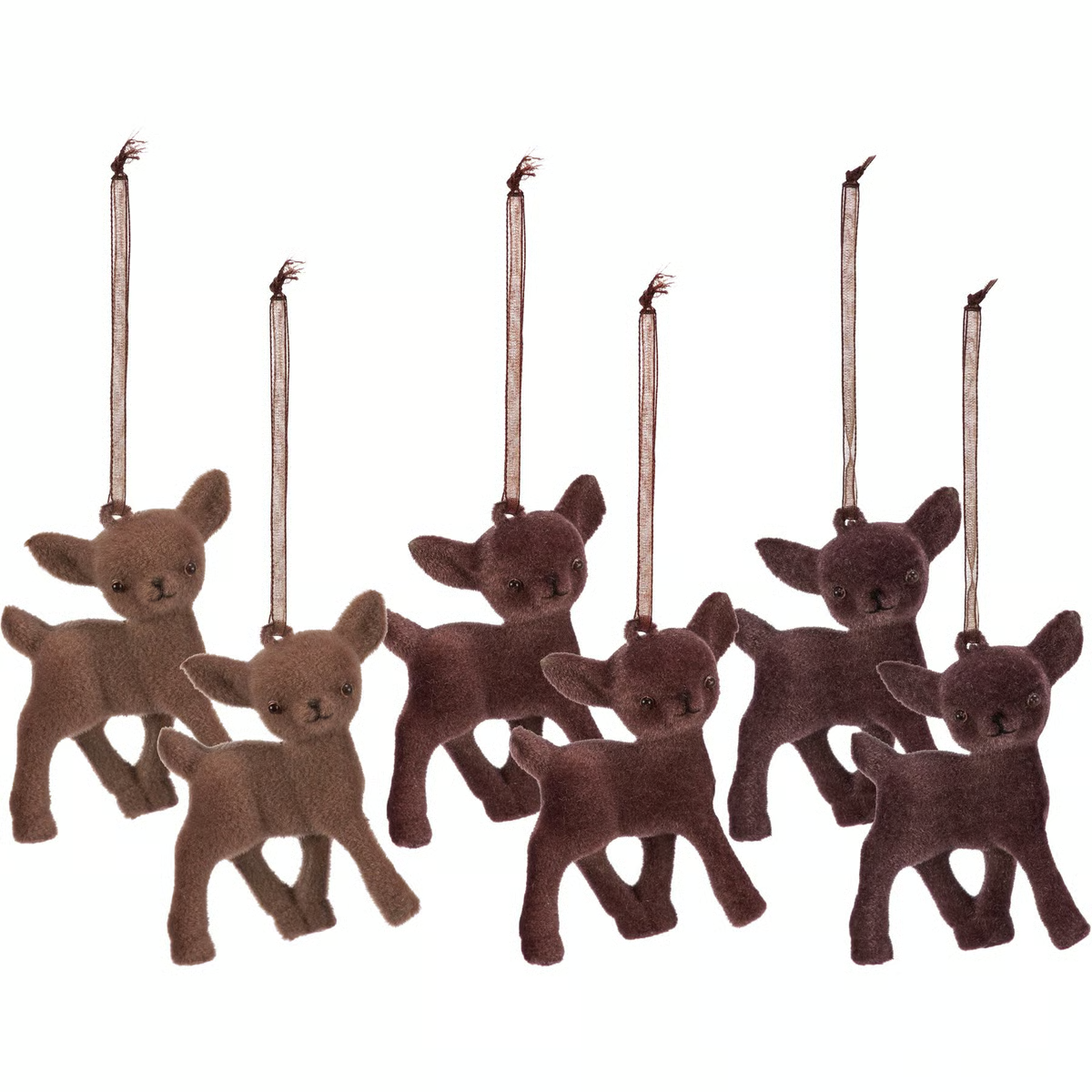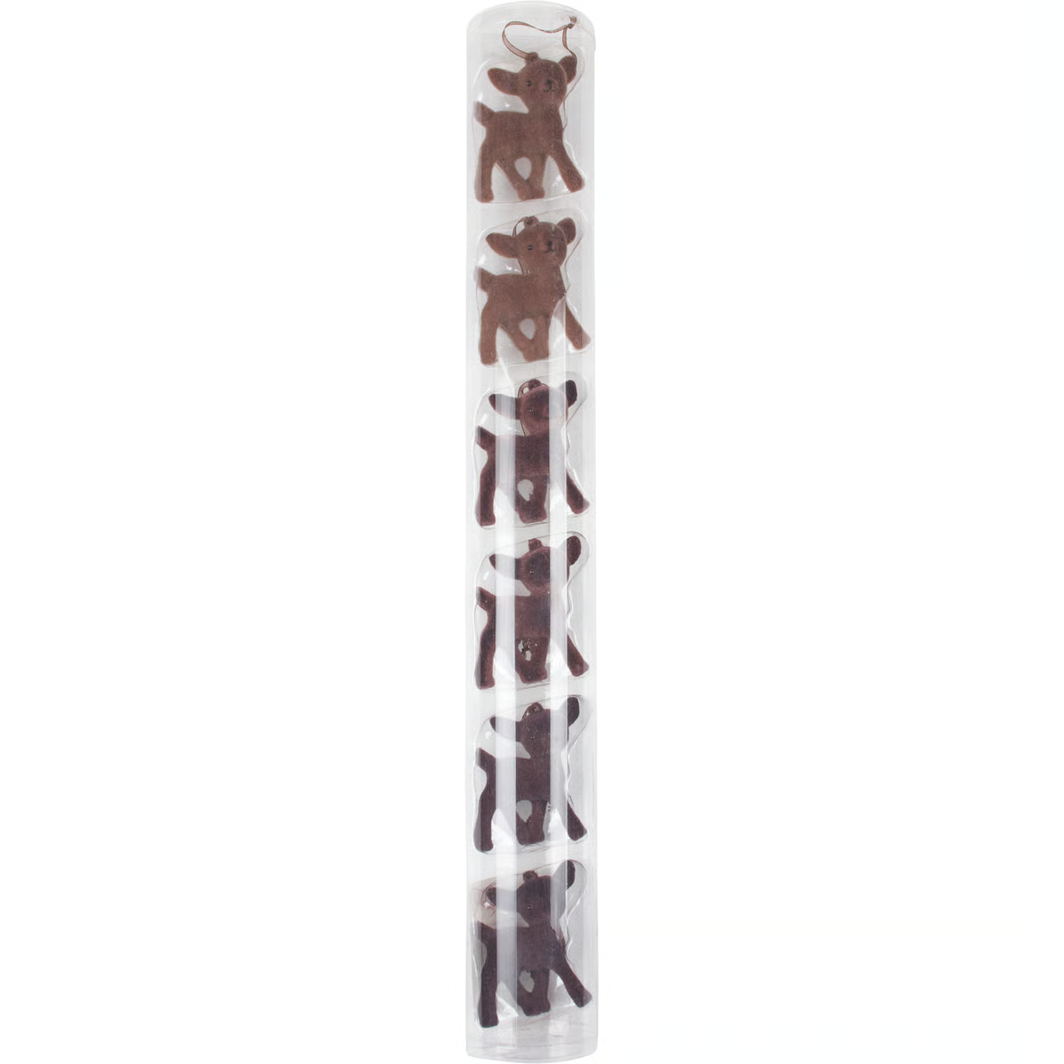 A set of six decorative ornaments from our Christmas Collection displaying deer designs with flocked detail and various shades of brown color. Our Flocked Deer ornament set is ready to hang via the attached ribbon loops. Set is packaged together in plastic tube. A rustic set of seasonal home accents perfect for a Christmas tree or for gifting.
