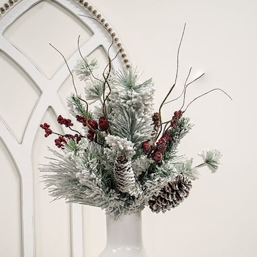 The Frosty Pines Bush is a decorative floral pick with a flexible, brown-wrapped stem. The pick is filled with pine greenery, red berry clusters, and rustic pinecones, all finished with a coat of thick white flocking for a fresh snowfall effect. Display this pick inside of a vase or pitcher to dress up the home with a festive woodland look during the Winter and Christmas season.