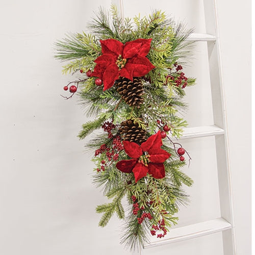 Winter Party Poinsettia & Pine 29" Faux Evergreen Teardrop