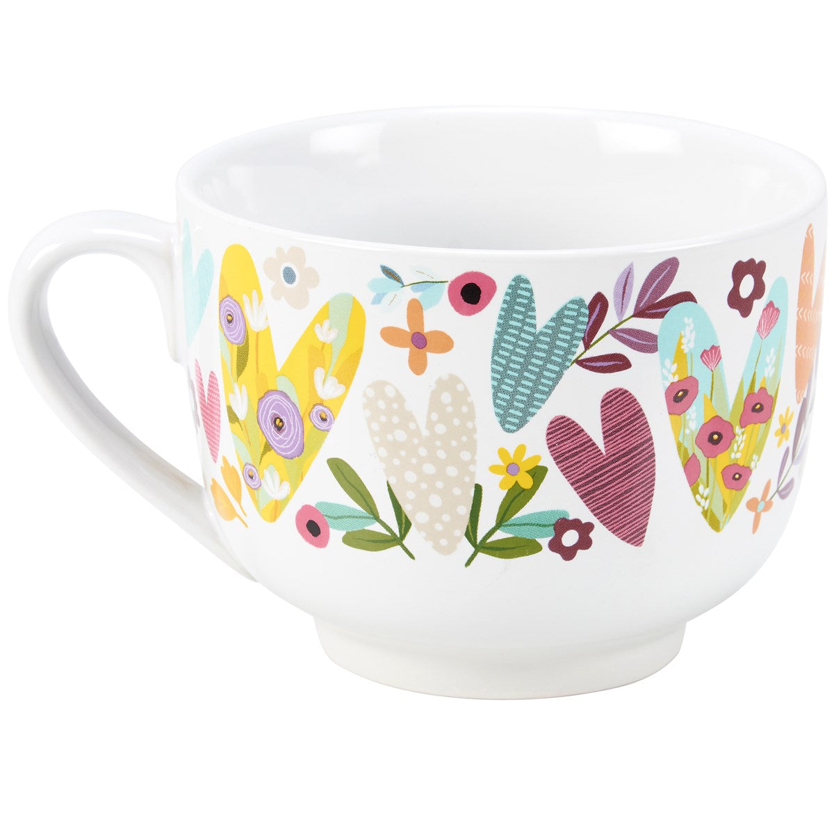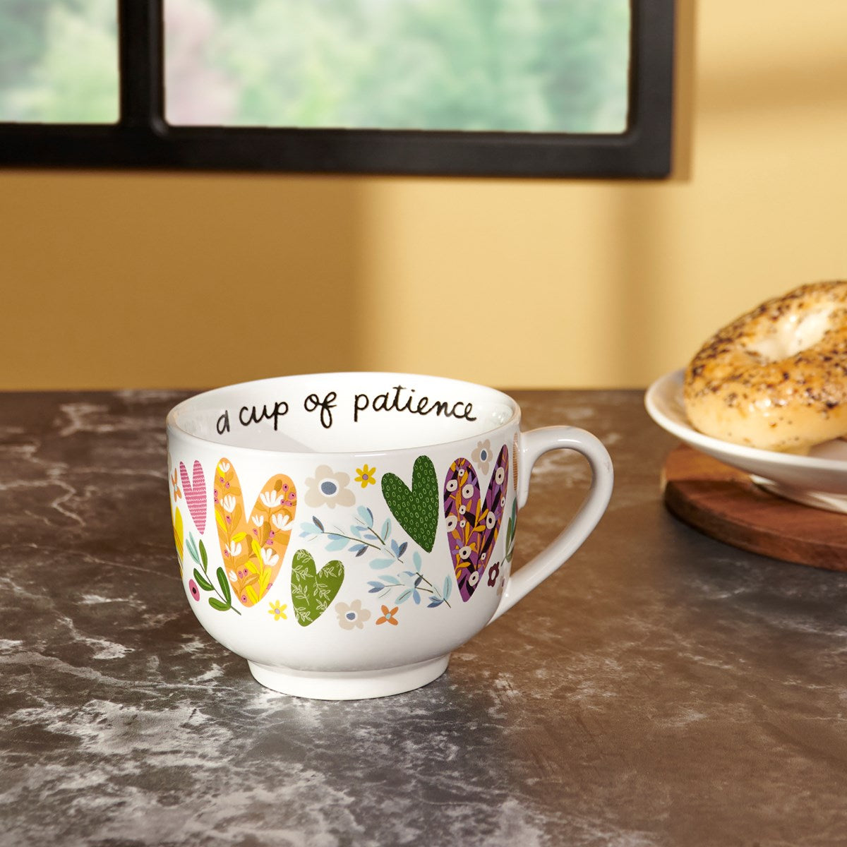 A stoneware 20 oz mug from our Inspiration & Blooms Collection displaying a full wrap-around design of colorful hearts with various hand illustrated patterns and designs. Mug also features an inside design with inspirational sentiment along the rim that reads "A Cup Of Patience" and patterned heart at the bottom. Our A Cup Of Patience mug is microwave, oven, dishwasher, and food safe. An inspirational mug perfect for everyday drinkware.
