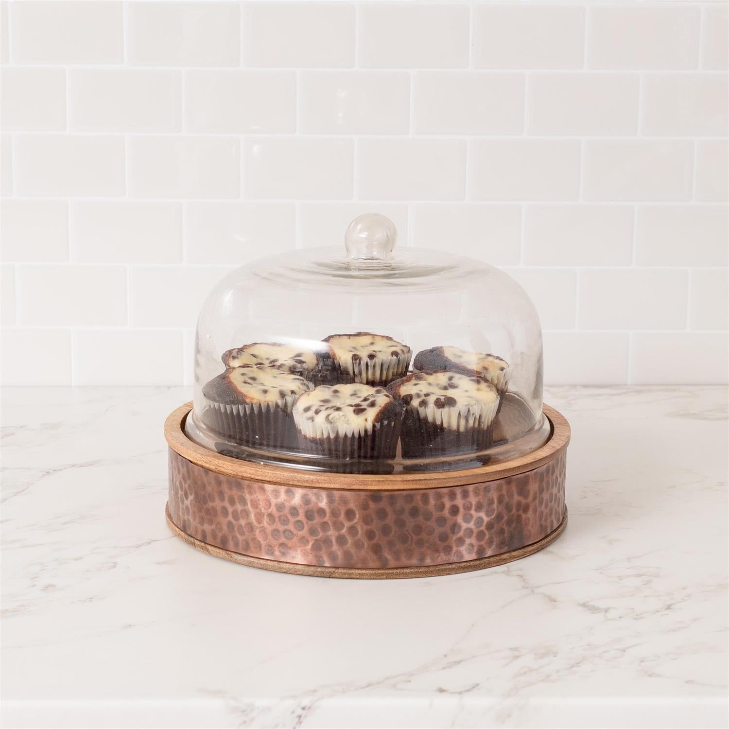 Glass Cloche with Wood Dimpled Base adds timeless charm to your kitchen or tabletop with its clear glass dome and warm wood base accented by a dimpled coppertone metal band. Perfect for displaying baked goods, seasonal décor, or decorative accents, this versatile piece blends beautifully with farmhouse, rustic, and classic home styling.