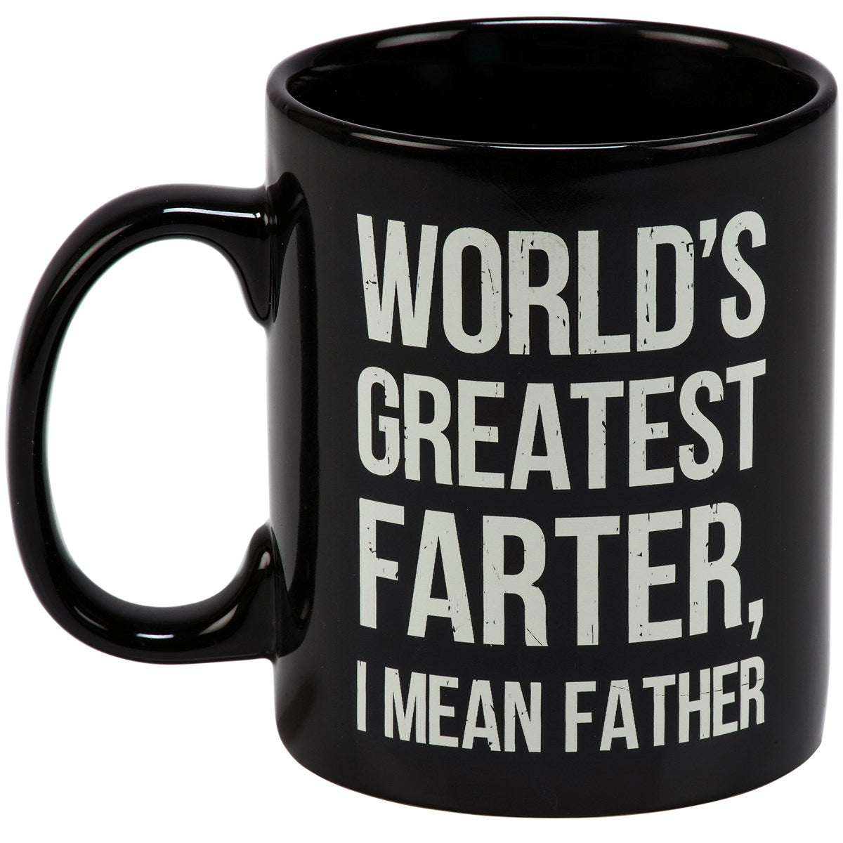 A stoneware 20 oz mug from our Father's Day Collection displaying a double-sided design on black color. Design features humorous dad-themed sentiment in a box sign style that reads "World's Greatest Farter, I Mean Father." Our World's Greatest Father mug is microwave, oven, dishwasher, and food safe. A fun dad-themed gift perfect for everyday drinkware.