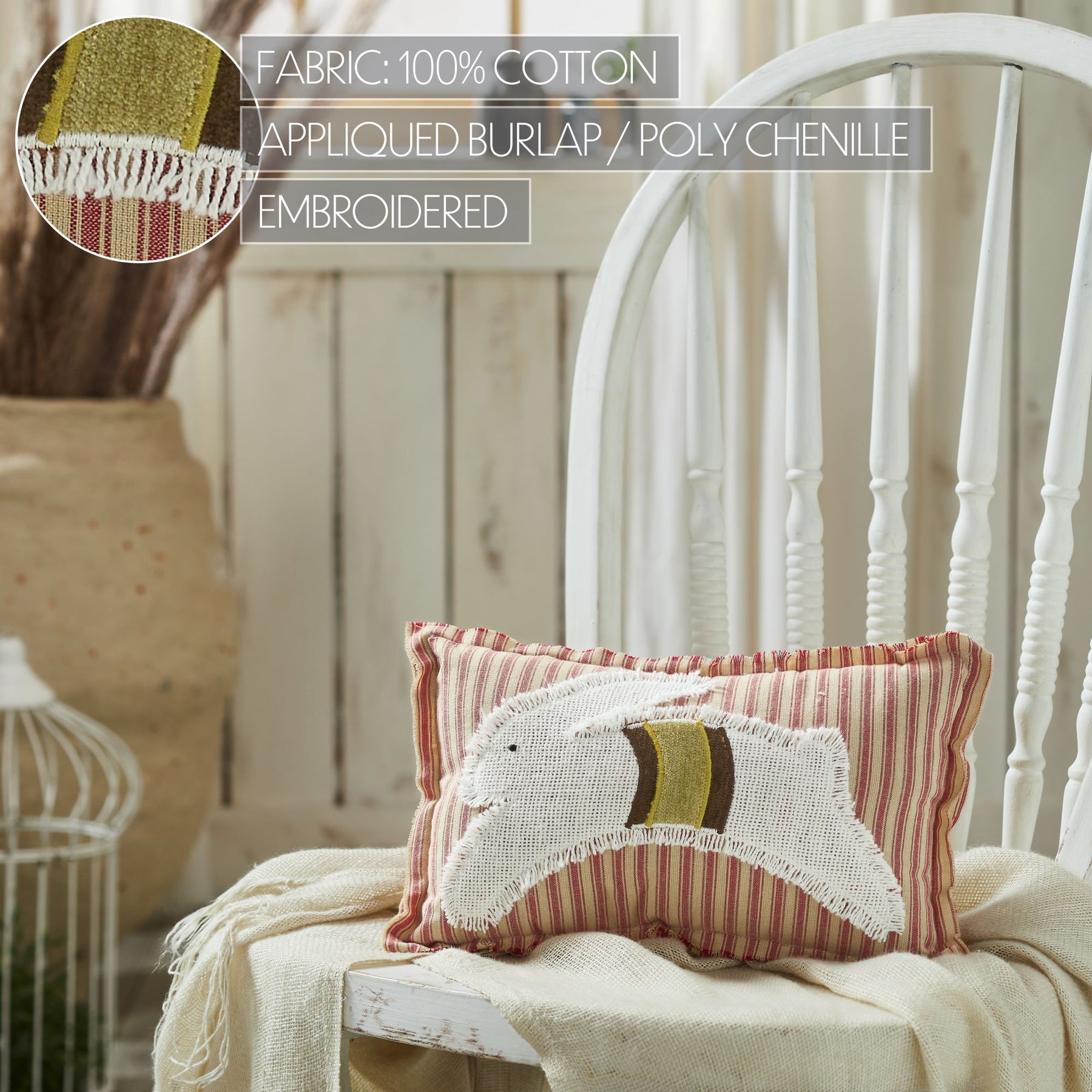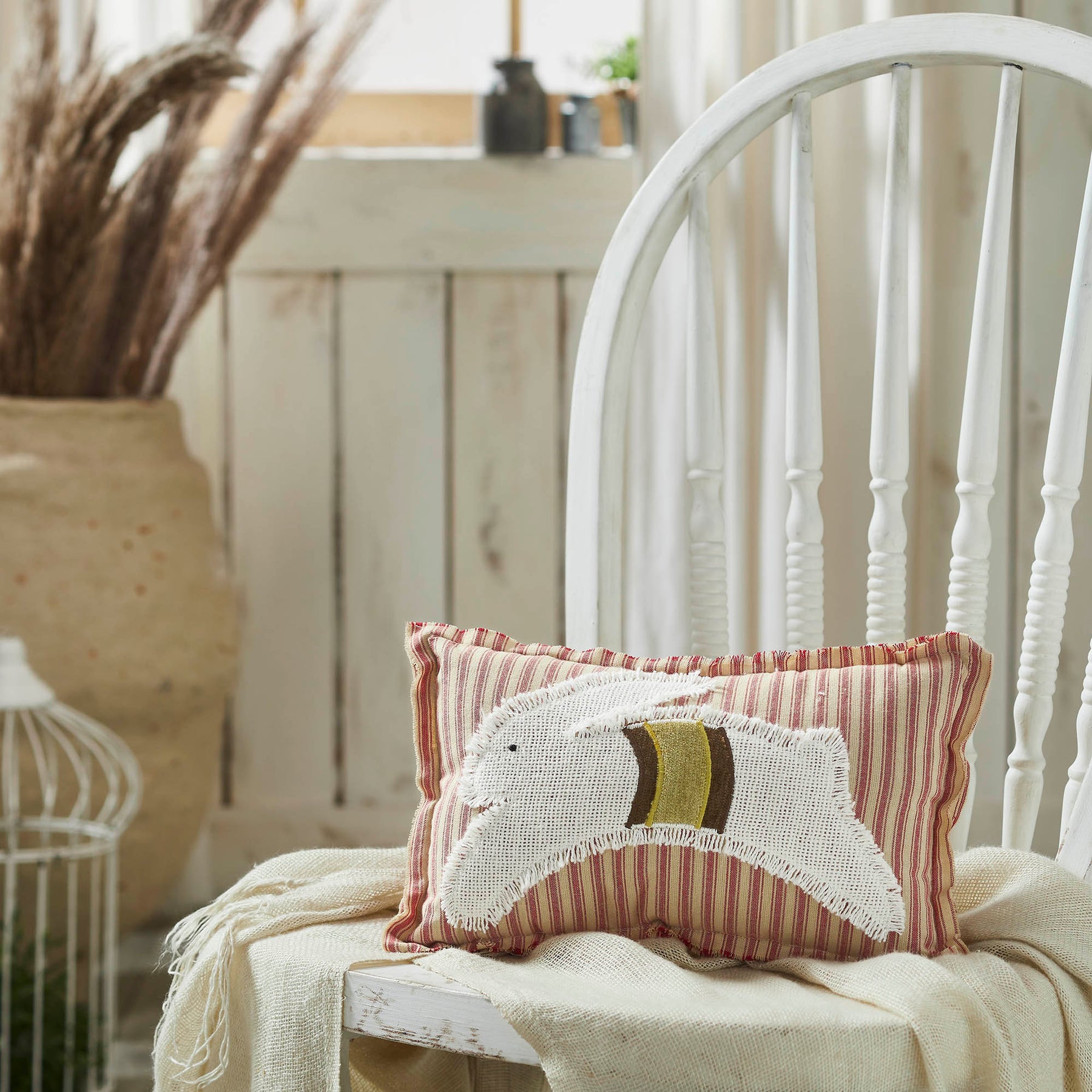 This sweet little pillow brings the gentlest touch of cottage charm to any space. The leaping bunny appliqué is full of texture and personality, set against warm, vintage-inspired stripes that feel right at home on a chair, bench, or layered with larger pillows. A perfect seasonal accent-or a year-round favorite for bunny lovers.