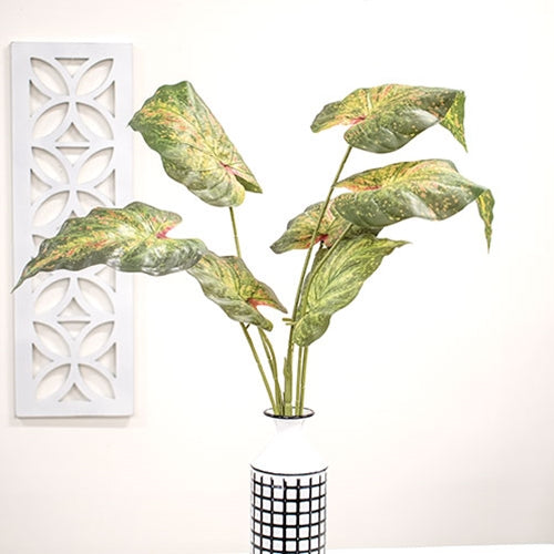 The Perilla Leaf Speckled Bush brings a fresh green touch to decorative displays. The bush features a full arrangement of large leaves sprouting from a green plastic stem. Detailed design with dimensional green coloring and bold pink specks gives the leaves a realistic look.