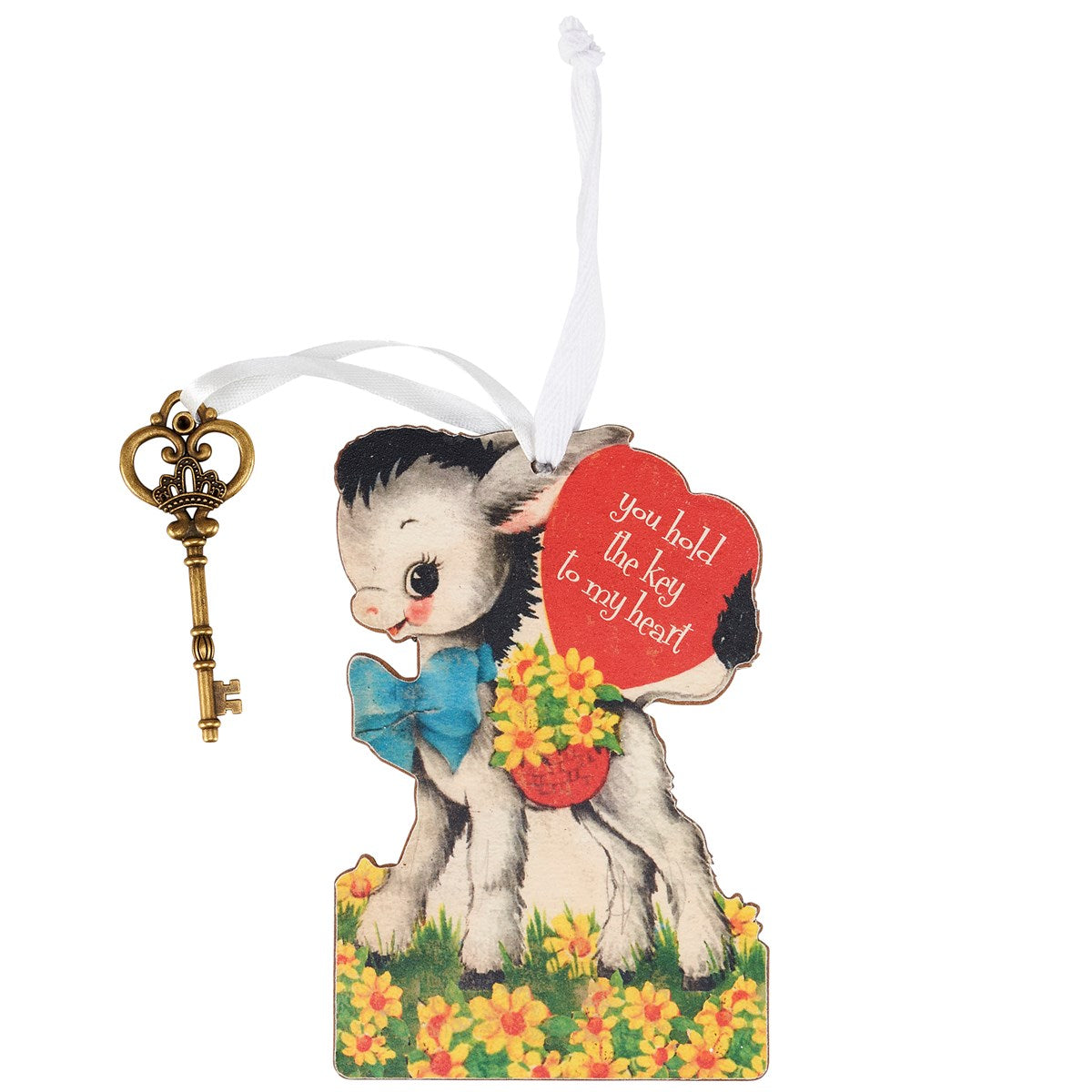 A double-sided wooden ornament from our Valentine's Day Collection displaying vintage art of a donkey wearing a bow and basket of flowers with Valentine's Day sentiments on each side that read "You Hold The Key To My Heart" and "You Make My Heart Happy." Our Key To My Heart ornament includes cotton tape loop for hanging and loop holding a brass key that plays on the fun sentiment. A fun seasonal home accent perfect for gifting.