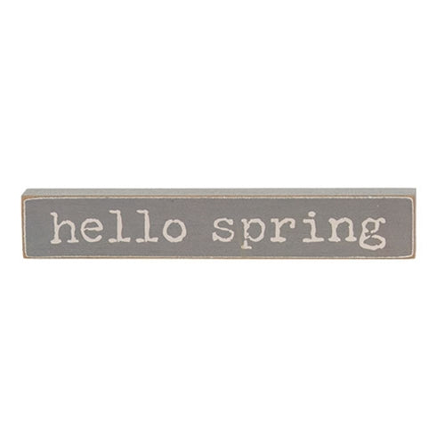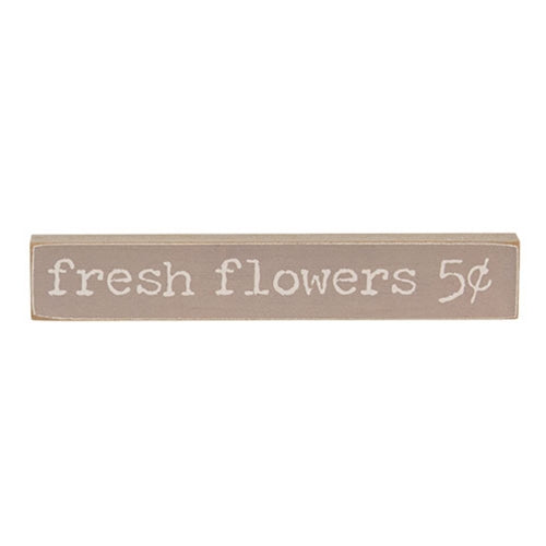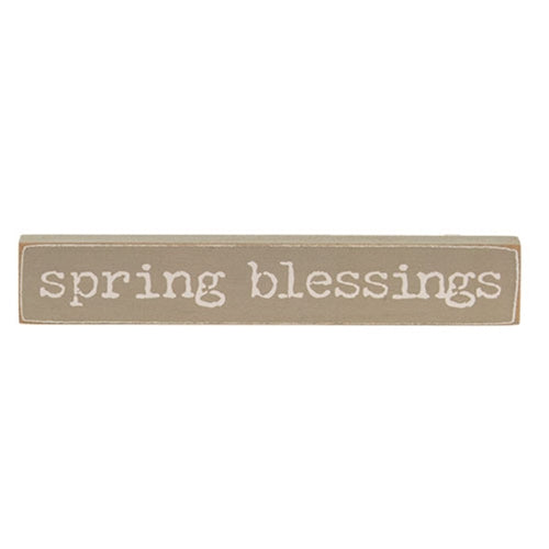 Spring Blessings Mini Sticks bring a rustic touch to springtime decor. Carved from wood, the sticks feature horizontal design and a stackable shape. Each stick is painted in a soft hue with a distressed finish and white typewriter-style text. One is pink and reads "fresh flowers 5¢," one is purple and reads "hello spring," and one is peach and reads "spring blessings.".