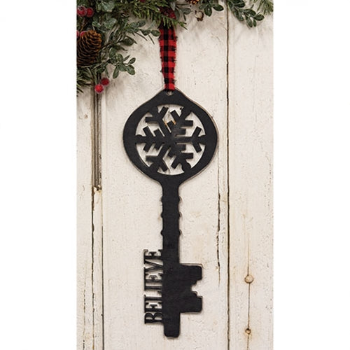 Wooden "Believe" Santa's Key Hanger is a unique decorative accent with vintage-inspired style that can hang on a doorknob, sit on a shelf, or tuck into a wreath. The wooden key features a lightly weathered black finish and a red gingham fabric hanging loop. The key is carved to depict a snowflake and the word, "believe."