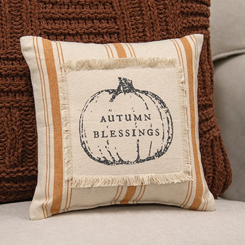 Autumn Blessings Orange Ticking Stripe Pillow is a decorative throw pillow with Autumnal farmhouse design. The pillow features cream and orange striped canvas material. One side of the pillow is adorned with a fringed patch that features a pumpkin and reads, "Autumn blessings."