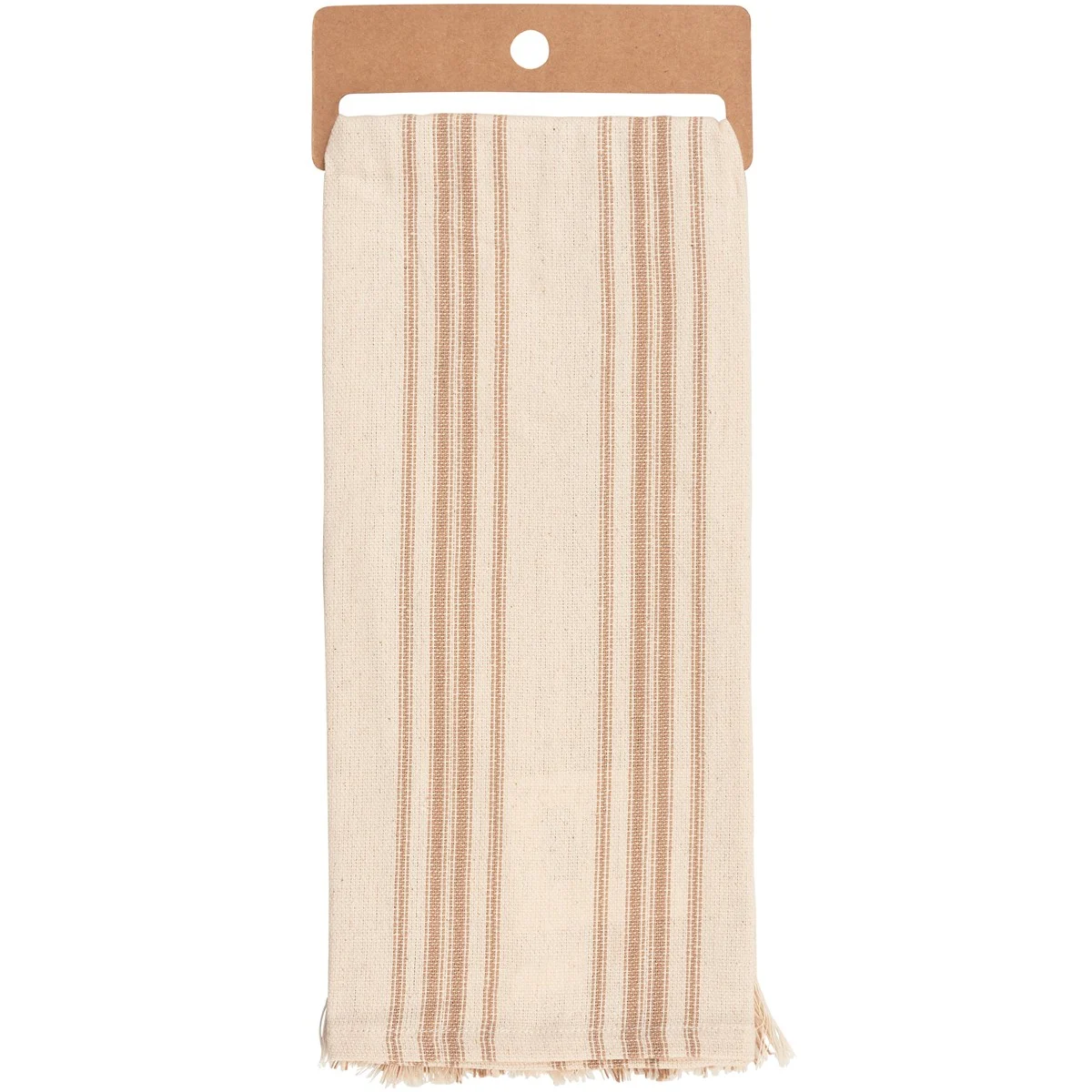 A cream cotton kitchen towel from our Farmhouse Collection featuring a stitched art panel with frayed border and woven brown stripes throughout. Design displays a brown horse in a field replicated from original artwork painted onto burlap canvas, giving the art a unique depth and texture. Our Horse kitchen towel is machine-washable for convenient cleaning.