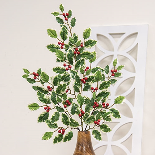 The Mini Holly Leaves Spray is a decorative floral pick with a sturdy brown twig-like stem. The spray is made of holly leaf branches and features clusters of mini red holly berries. Display this spray inside of a vase, pitcher, or basket during the Winter and Christmas season for a natural and festive look in the home.