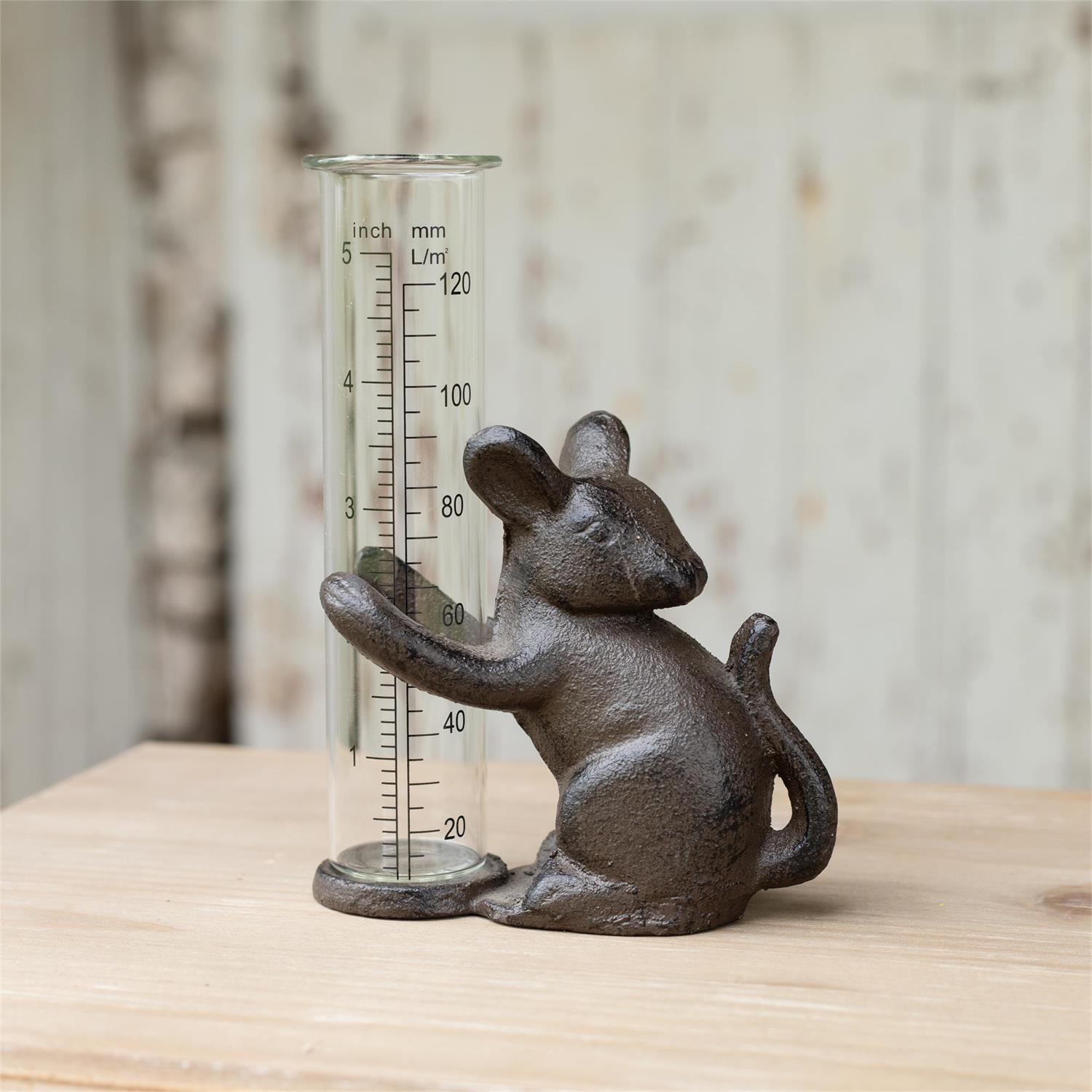 Keep tabs on the rainfall with a touch of whimsy using this cast iron mouse rain gauge. The sturdy metal mouse holds a removable glass measuring tube, combining garden charm with practical use. A fun and functional accent outdoors, it also doubles as a charming decorative piece indoors on a shelf, windowsill, or sunroom display.