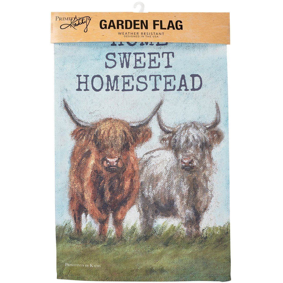 A double-sided polyester garden flag from our Homestead Collection displaying a charming hand painted scene of a brown and a white highland cow in a field with a farm-themed sentiment that reads "Home Sweet Homestead." Design is replicated from original artwork painted onto burlap canvas, giving the art a unique depth and texture. Garden flag is weather-resistant and features an opening to hang on our Garden Flag Pole. Our Home Sweet Homestead garden flag is packaged with a header card and hook to easily hang on rack. Hand wash only. A farm-themed home accent perfect for everyday display in any yard or garden.
